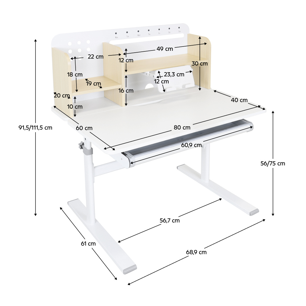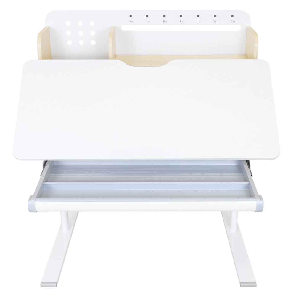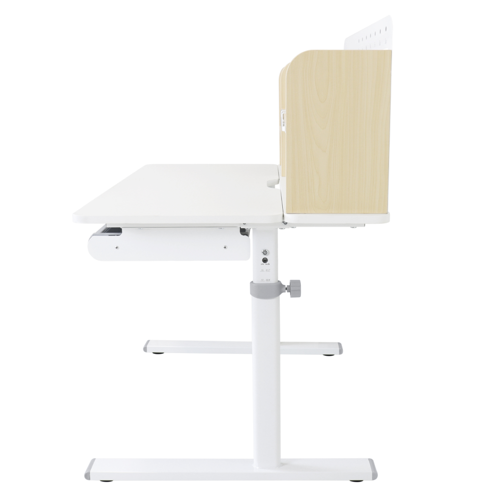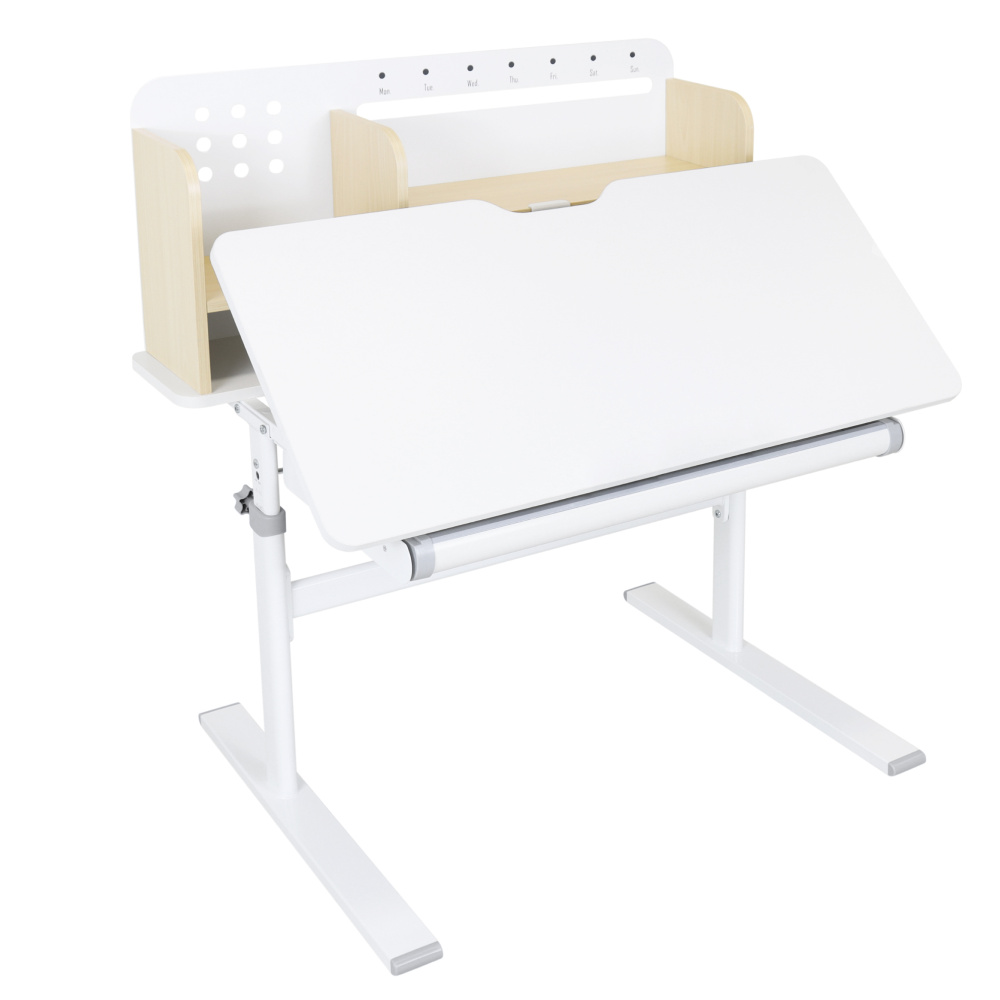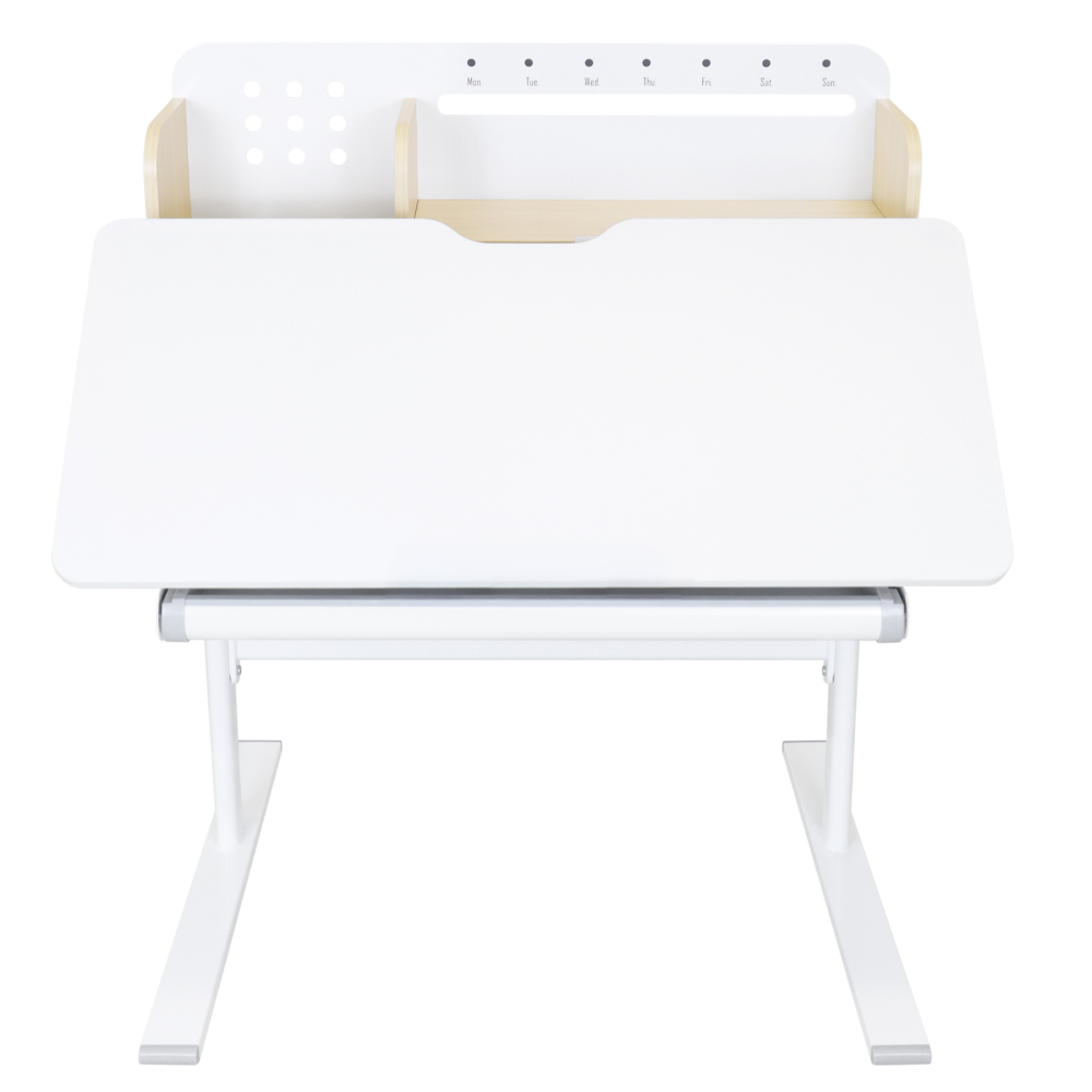 Materiál: laminovaná MDF/plast/kov Barva: přírodní/bílá Deska stolu je s PVC hranami Rozměry stolu (ŠxHxV): 80x60x91,5-111,5 cm Šířka podstavy: 68,9 cm Hloubka podstavy: 61 cm Výška pracovní plochy: 56-75 cm Hloubka polohovací části pracovní desky: 40 cm Šířka a výška zadního panelu: 75,6x36,5 cm Šířka menší police: 22 cm Šířka větší police: 49 cm Šířka zásuvky: 60,9 cm Tloušťka materiálu MDF: 1,5 cm Sklon pracovní desky: 0-40° Nastavitelný sklon pracovní desky Nastavitelná výška stolu Plynulé nastavení výšky stolu a úhlu pracovní plochy Manuální nastavení výšky stolu pomocí kliky Kliku lze umístit z pravé nebo z levé strany Nastavení úhlu pracovní plochy pomocí plynového pístu a páčky Prostorná zásuvka s přihrádkou Police na knihy Držák na knihy Lišta s označením dní V zadní části police se nachází otvor pro vedení kabelů Vhodné od 3 do 12 let Pro děti o výšce 100 - 150 cm Dodáváno v demontu