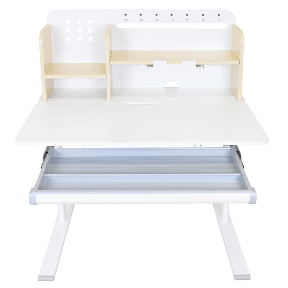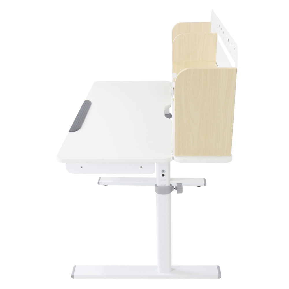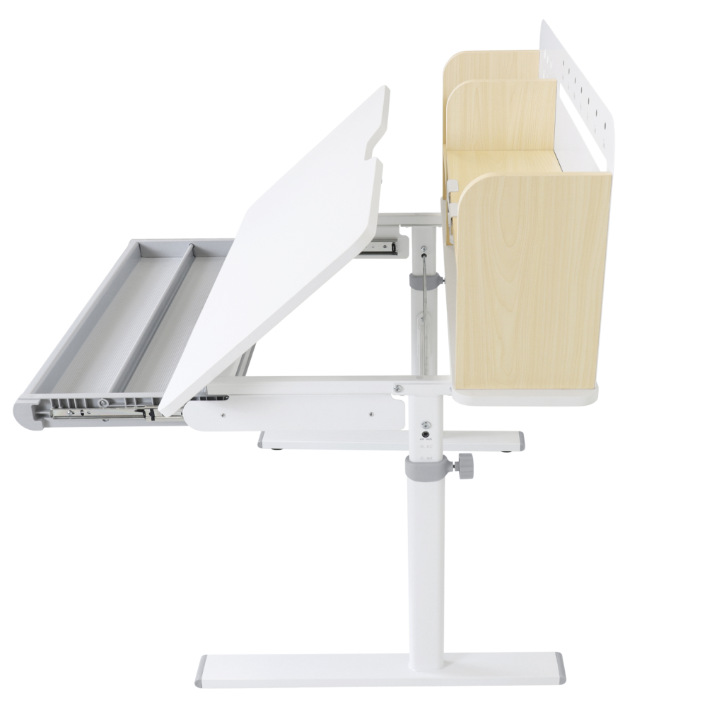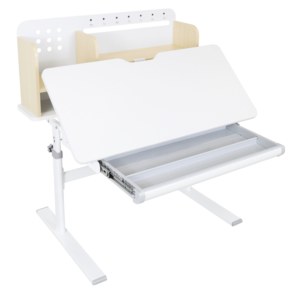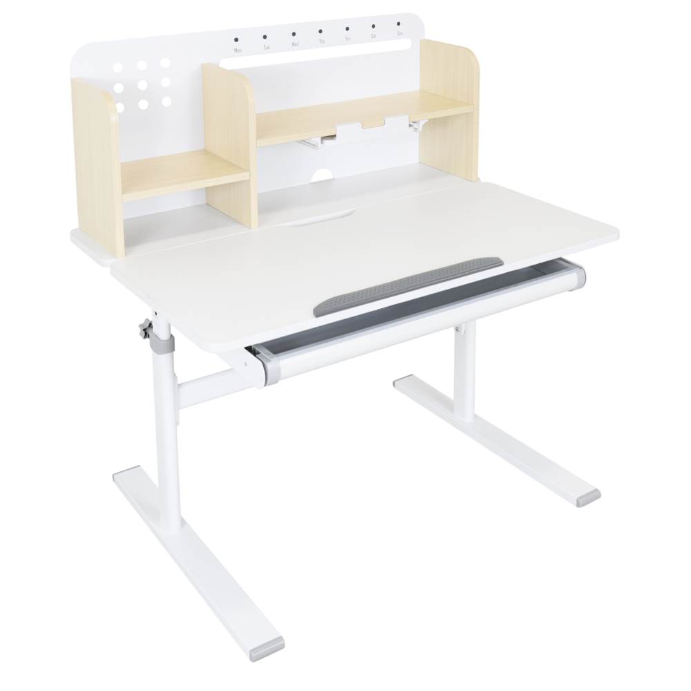 Materiál: laminovaná MDF/plast/kov Barva: přírodní/bílá Deska stolu je s PVC hranami Rozměry stolu (ŠxHxV): 80x60x91,5-111,5 cm Šířka podstavy: 68,9 cm Hloubka podstavy: 61 cm Výška pracovní plochy: 56-75 cm Hloubka polohovací části pracovní desky: 40 cm Šířka a výška zadního panelu: 75,6x36,5 cm Šířka menší police: 22 cm Šířka větší police: 49 cm Šířka zásuvky: 60,9 cm Tloušťka materiálu MDF: 1,5 cm Sklon pracovní desky: 0-40° Nastavitelný sklon pracovní desky Nastavitelná výška stolu Plynulé nastavení výšky stolu a úhlu pracovní plochy Manuální nastavení výšky stolu pomocí kliky Kliku lze umístit z pravé nebo z levé strany Nastavení úhlu pracovní plochy pomocí plynového pístu a páčky Prostorná zásuvka s přihrádkou Police na knihy Držák na knihy Lišta s označením dní V zadní části police se nachází otvor pro vedení kabelů Vhodné od 3 do 12 let Pro děti o výšce 100 - 150 cm Dodáváno v demontu