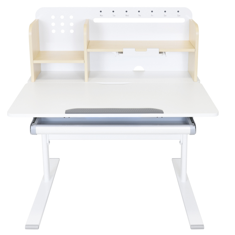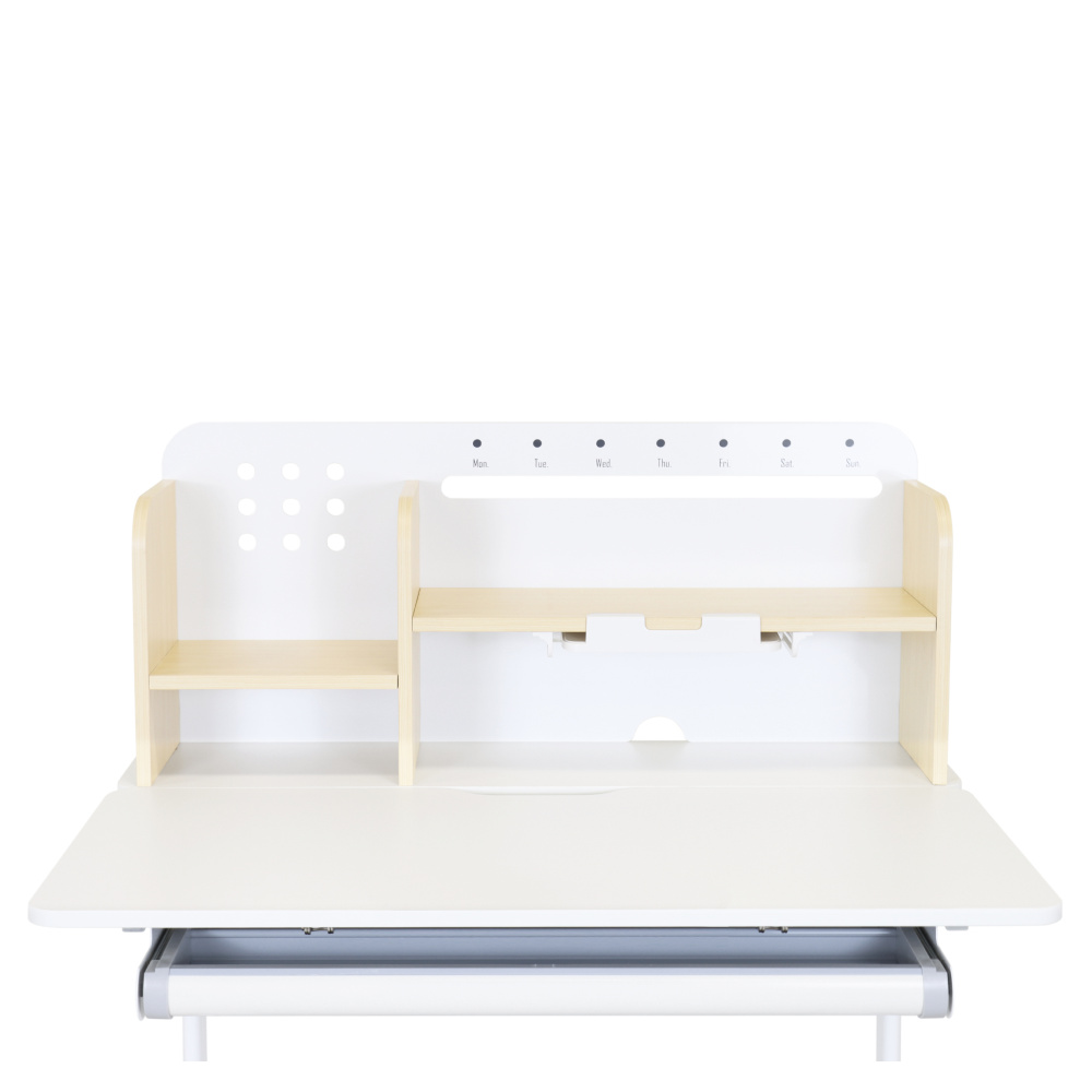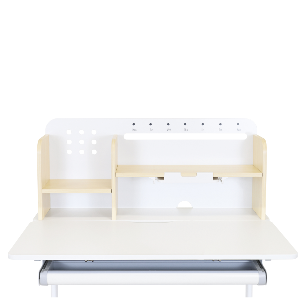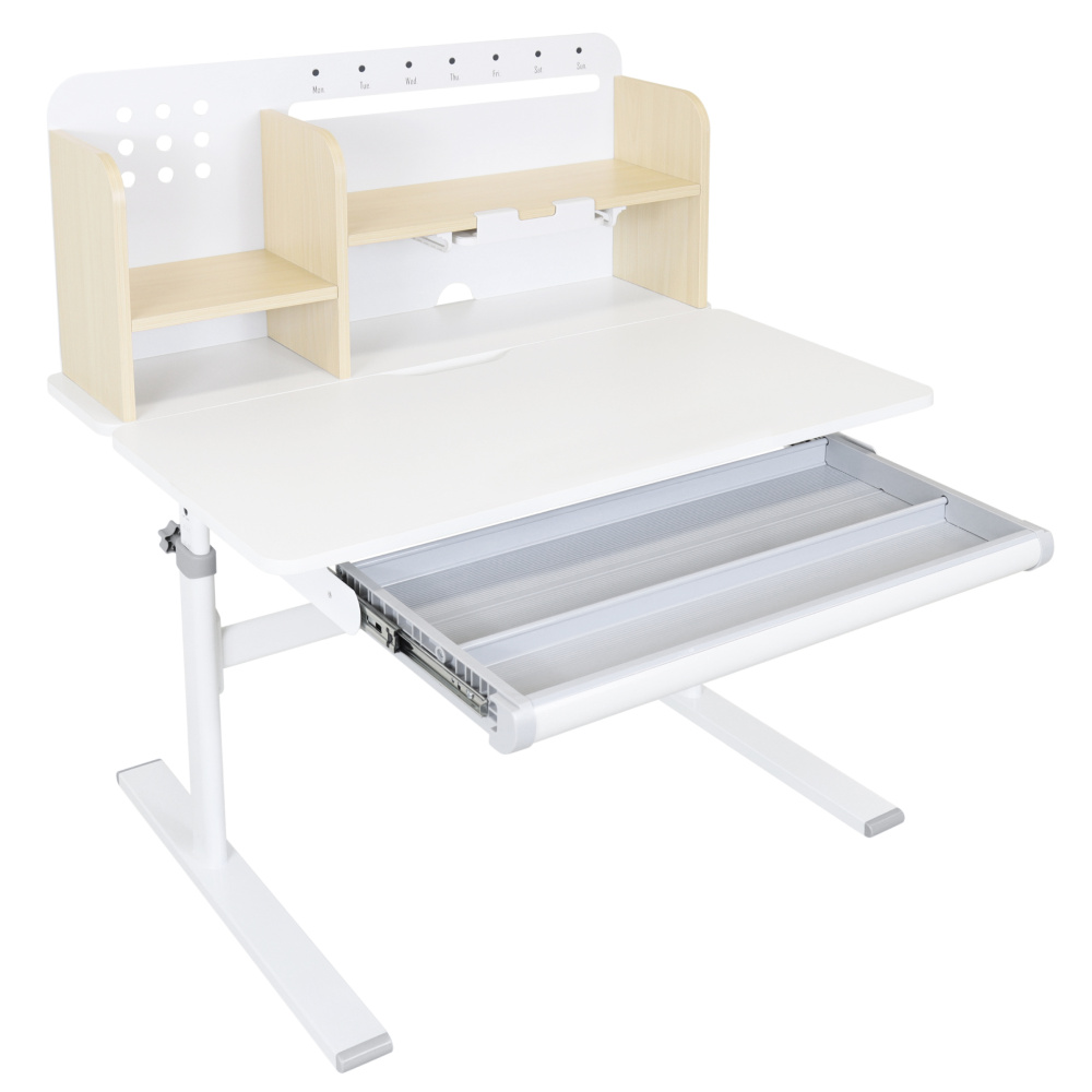 Materiál: laminovaná MDF/plast/kov Barva: přírodní/bílá Deska stolu je s PVC hranami Rozměry stolu (ŠxHxV): 80x60x91,5-111,5 cm Šířka podstavy: 68,9 cm Hloubka podstavy: 61 cm Výška pracovní plochy: 56-75 cm Hloubka polohovací části pracovní desky: 40 cm Šířka a výška zadního panelu: 75,6x36,5 cm Šířka menší police: 22 cm Šířka větší police: 49 cm Šířka zásuvky: 60,9 cm Tloušťka materiálu MDF: 1,5 cm Sklon pracovní desky: 0-40° Nastavitelný sklon pracovní desky Nastavitelná výška stolu Plynulé nastavení výšky stolu a úhlu pracovní plochy Manuální nastavení výšky stolu pomocí kliky Kliku lze umístit z pravé nebo z levé strany Nastavení úhlu pracovní plochy pomocí plynového pístu a páčky Prostorná zásuvka s přihrádkou Police na knihy Držák na knihy Lišta s označením dní V zadní části police se nachází otvor pro vedení kabelů Vhodné od 3 do 12 let Pro děti o výšce 100 - 150 cm Dodáváno v demontu