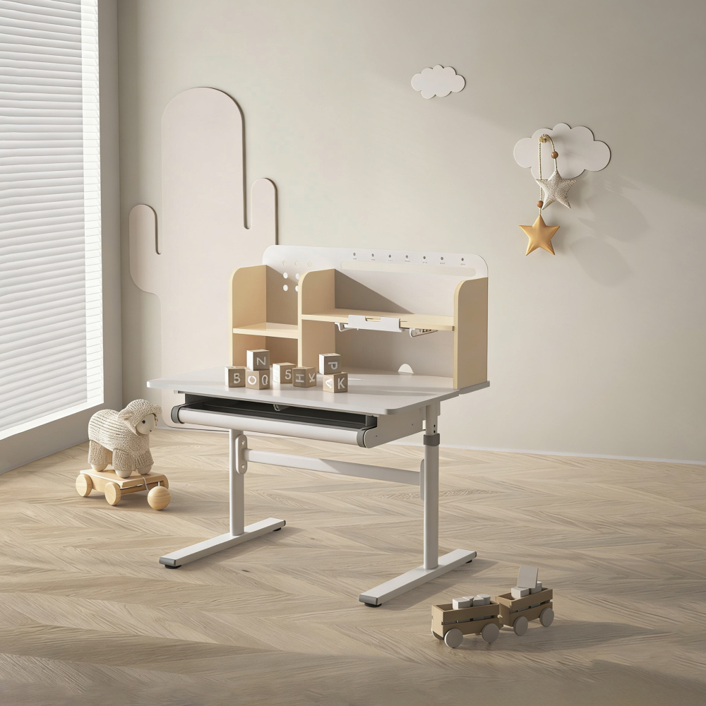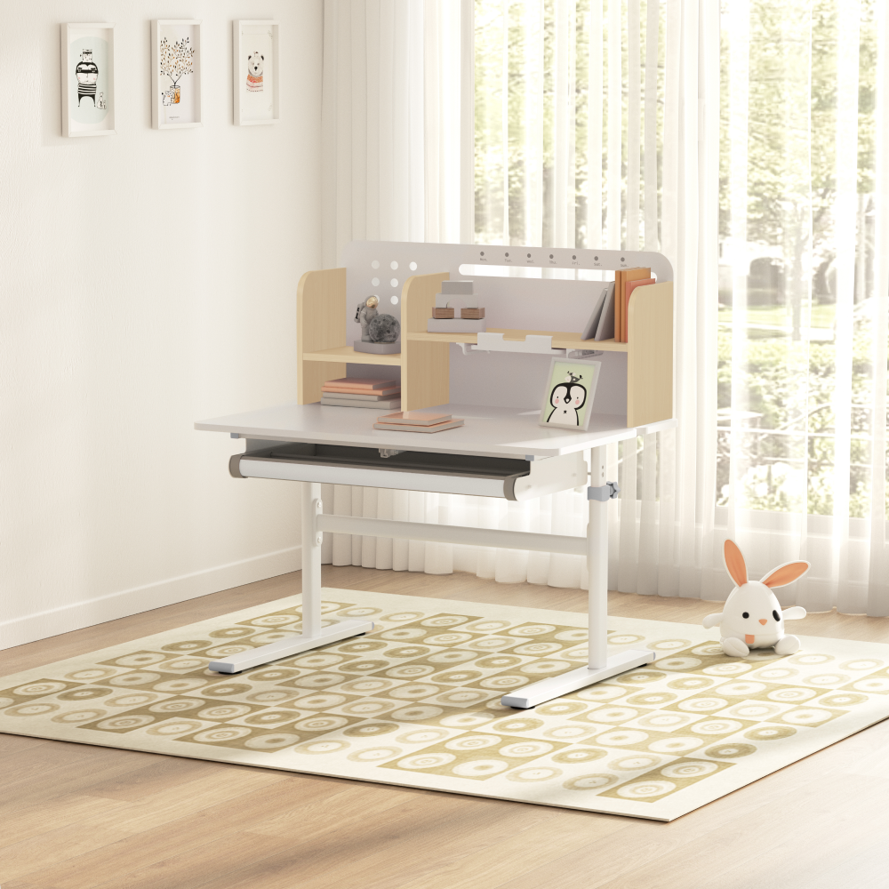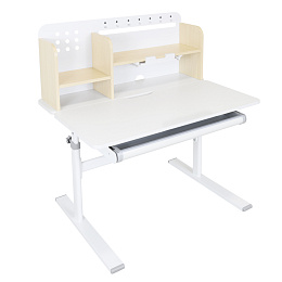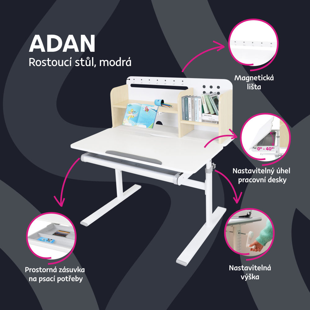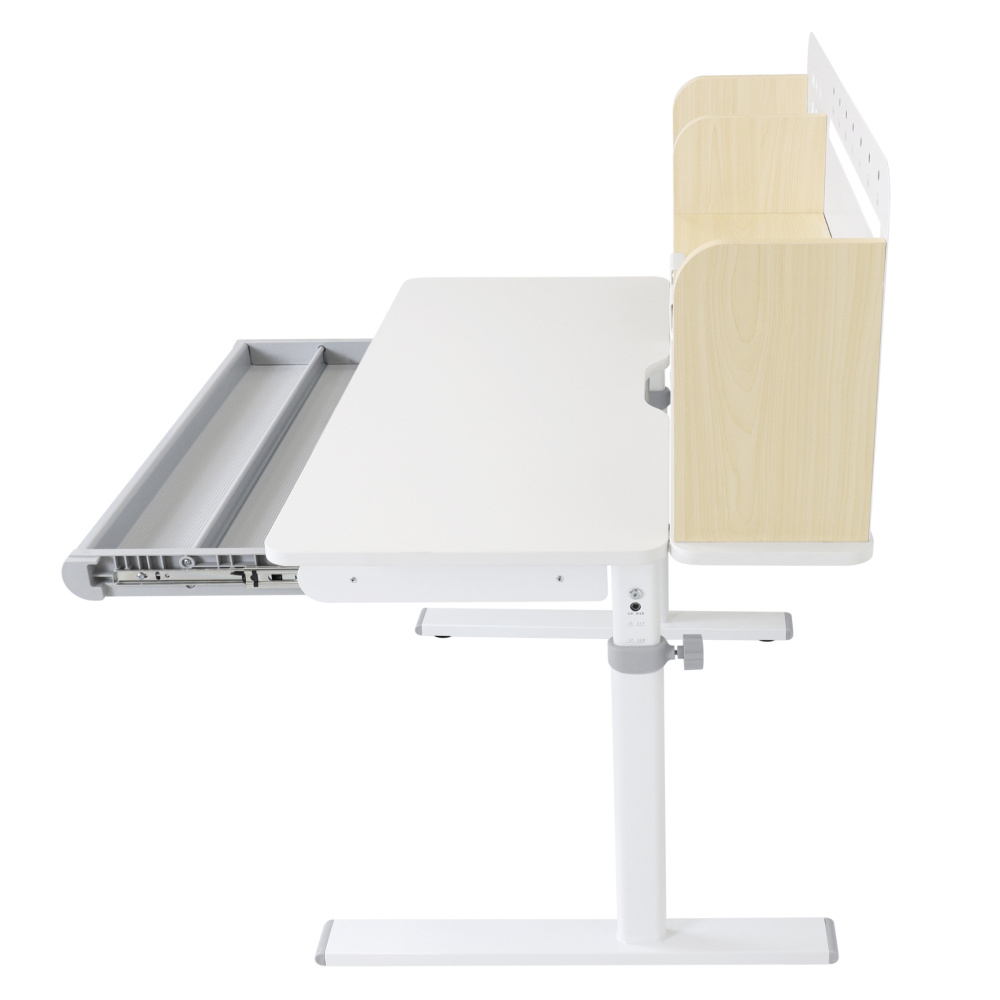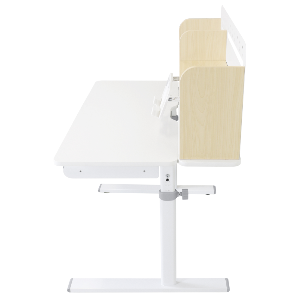 Materiál: laminovaná MDF/plast/kov Barva: přírodní/bílá Deska stolu je s PVC hranami Rozměry stolu (ŠxHxV): 80x60x91,5-111,5 cm Šířka podstavy: 68,9 cm Hloubka podstavy: 61 cm Výška pracovní plochy: 56-75 cm Hloubka polohovací části pracovní desky: 40 cm Šířka a výška zadního panelu: 75,6x36,5 cm Šířka menší police: 22 cm Šířka větší police: 49 cm Šířka zásuvky: 60,9 cm Tloušťka materiálu MDF: 1,5 cm Sklon pracovní desky: 0-40° Nastavitelný sklon pracovní desky Nastavitelná výška stolu Plynulé nastavení výšky stolu a úhlu pracovní plochy Manuální nastavení výšky stolu pomocí kliky Kliku lze umístit z pravé nebo z levé strany Nastavení úhlu pracovní plochy pomocí plynového pístu a páčky Prostorná zásuvka s přihrádkou Police na knihy Držák na knihy Lišta s označením dní V zadní části police se nachází otvor pro vedení kabelů Vhodné od 3 do 12 let Pro děti o výšce 100 - 150 cm Dodáváno v demontu