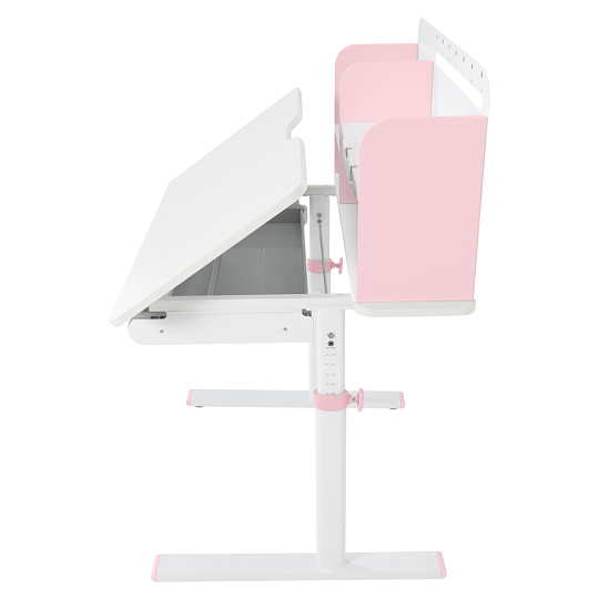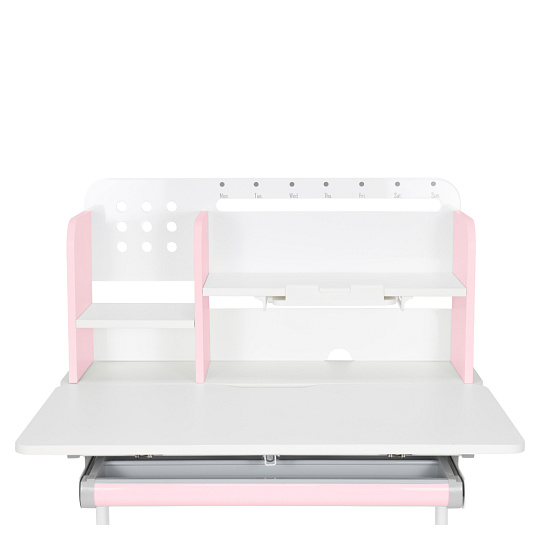 Materiál: laminovaná MDF/plast/kov Barva: růžová/bílá Deska stolu je s PVC hranami Rozměry stolu (ŠxHxV): 80x60x91,5-111,5 cm Šířka podstavy: 68,9 cm Hloubka podstavy: 61 cm Výška pracovní plochy: 56-75 cm Hloubka polohovací části pracovní desky: 40 cm Šířka a výška zadního panelu: 75,6x36,5 cm Šířka menší police: 22 cm Šířka větší police: 49 cm Šířka zásuvky: 60,9 cm Tloušťka materiálu MDF: 1,5 cm Sklon pracovní desky: 0-40° Nastavitelný sklon pracovní desky Nastavitelná výška stolu Plynulé nastavení výšky stolu a úhlu pracovní plochy Manuální nastavení výšky stolu pomocí kliky Kliku lze umístit z pravé nebo z levé strany Nastavení úhlu pracovní plochy pomocí plynového pístu a páčky Prostorná zásuvka s přihrádkou Police na knihy Držák na knihy Lišta s označením dní V zadní části police se nachází otvor pro vedení kabelů Vhodné od 3 do 12 let Pro děti o výšce 100 - 150 cm Dodáváno v demontu