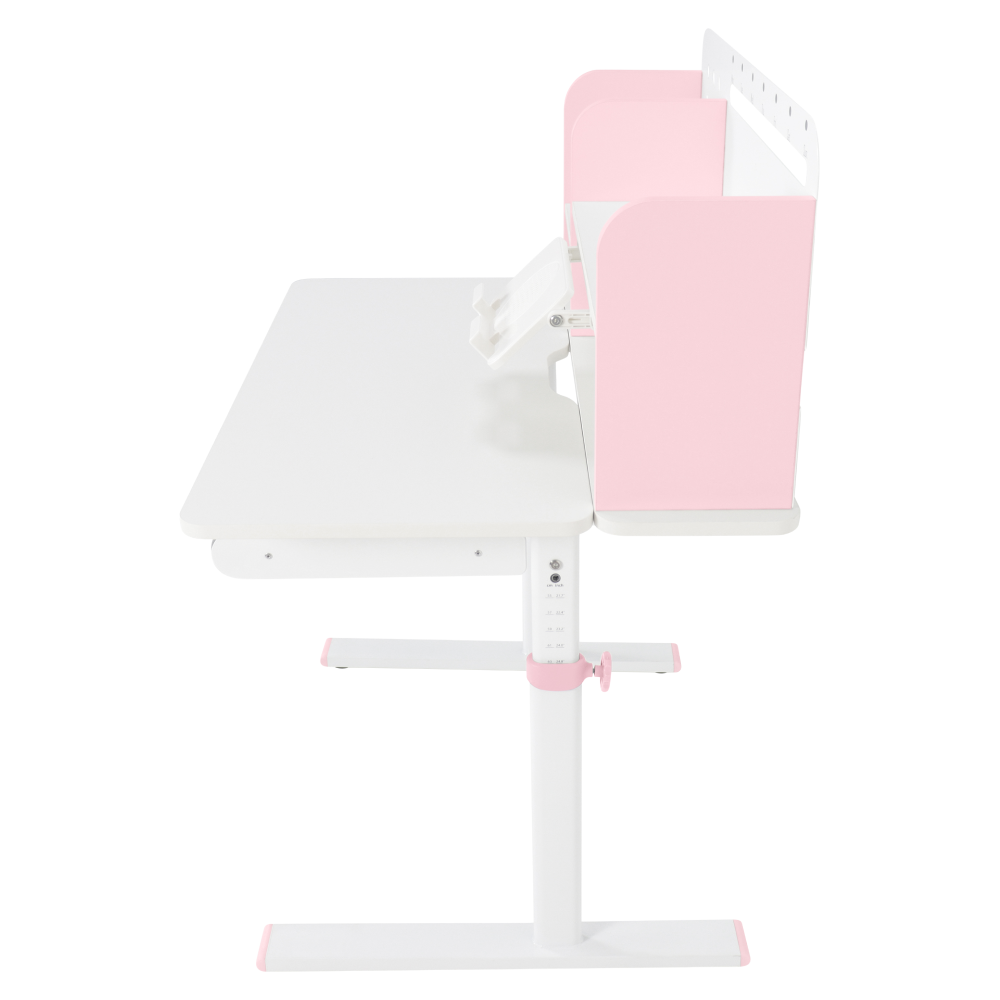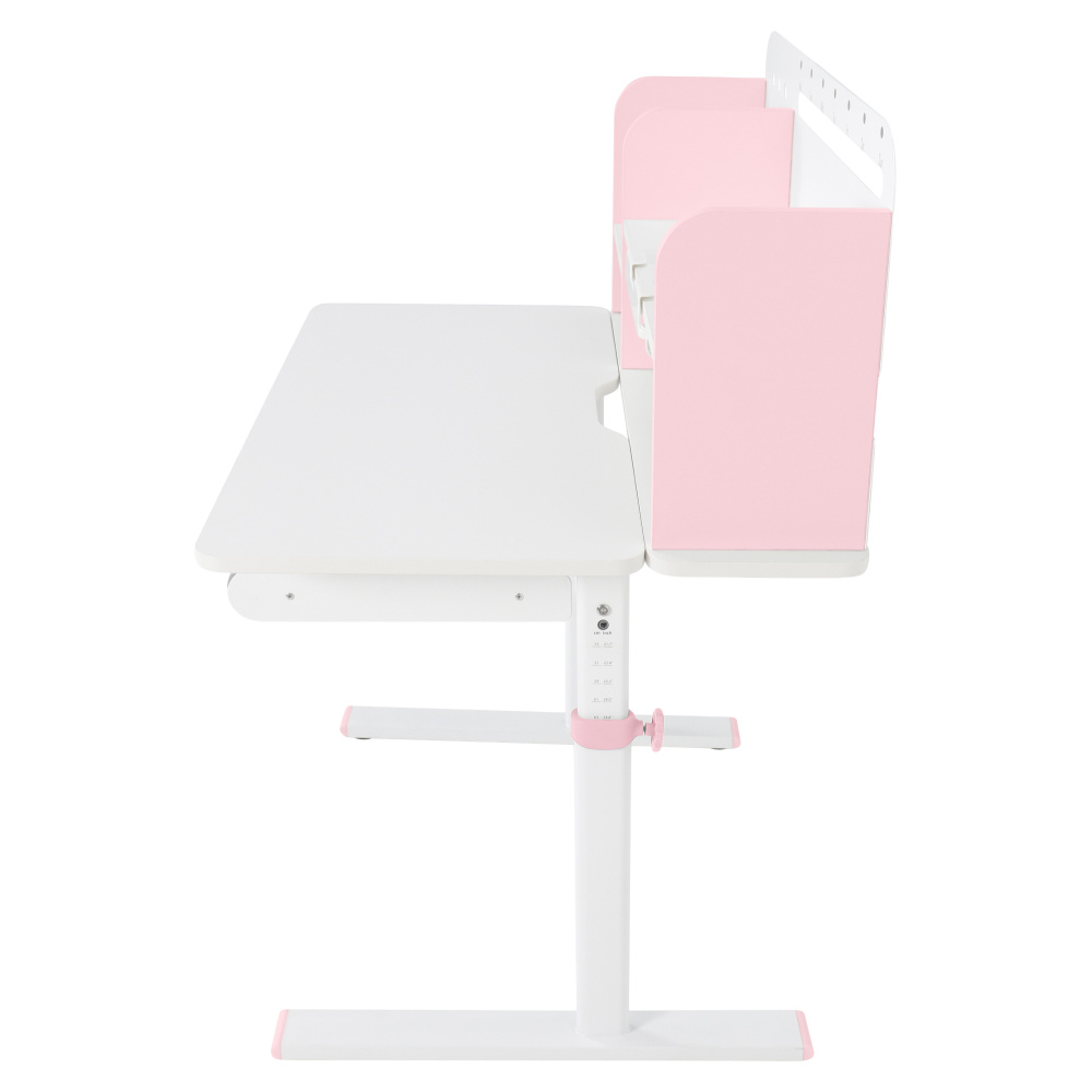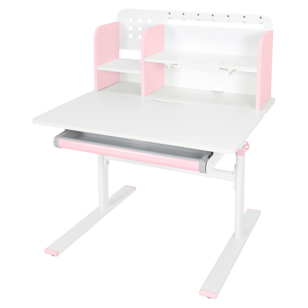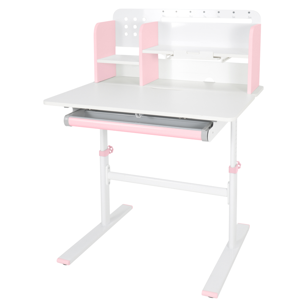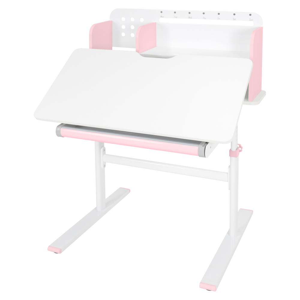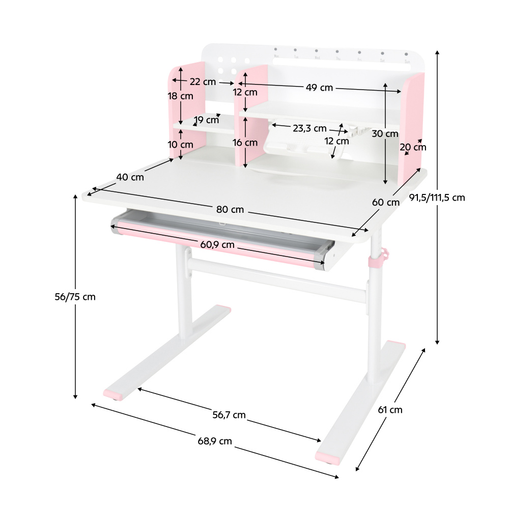 Materiál: laminovaná MDF/plast/kov Barva: růžová/bílá Deska stolu je s PVC hranami Rozměry stolu (ŠxHxV): 80x60x91,5-111,5 cm Šířka podstavy: 68,9 cm Hloubka podstavy: 61 cm Výška pracovní plochy: 56-75 cm Hloubka polohovací části pracovní desky: 40 cm Šířka a výška zadního panelu: 75,6x36,5 cm Šířka menší police: 22 cm Šířka větší police: 49 cm Šířka zásuvky: 60,9 cm Tloušťka materiálu MDF: 1,5 cm Sklon pracovní desky: 0-40° Nastavitelný sklon pracovní desky Nastavitelná výška stolu Plynulé nastavení výšky stolu a úhlu pracovní plochy Manuální nastavení výšky stolu pomocí kliky Kliku lze umístit z pravé nebo z levé strany Nastavení úhlu pracovní plochy pomocí plynového pístu a páčky Prostorná zásuvka s přihrádkou Police na knihy Držák na knihy Lišta s označením dní V zadní části police se nachází otvor pro vedení kabelů Vhodné od 3 do 12 let Pro děti o výšce 100 - 150 cm Dodáváno v demontu