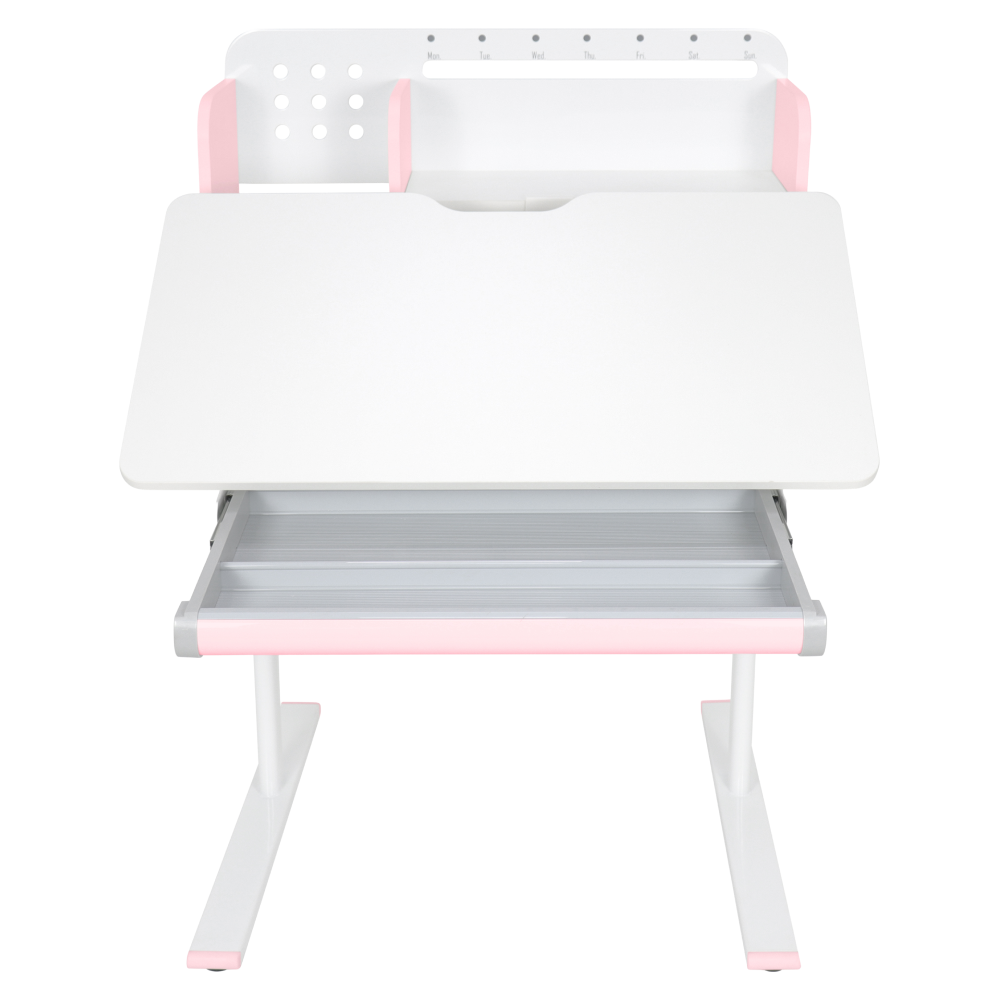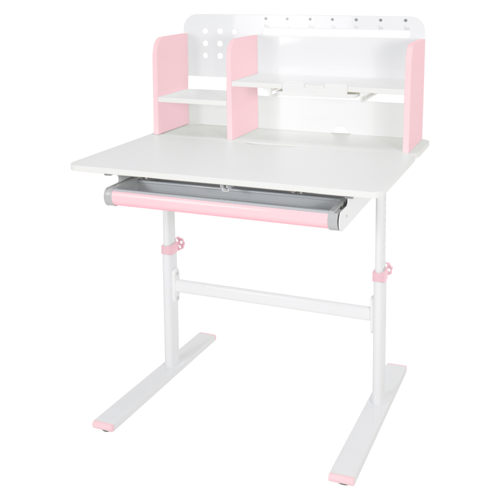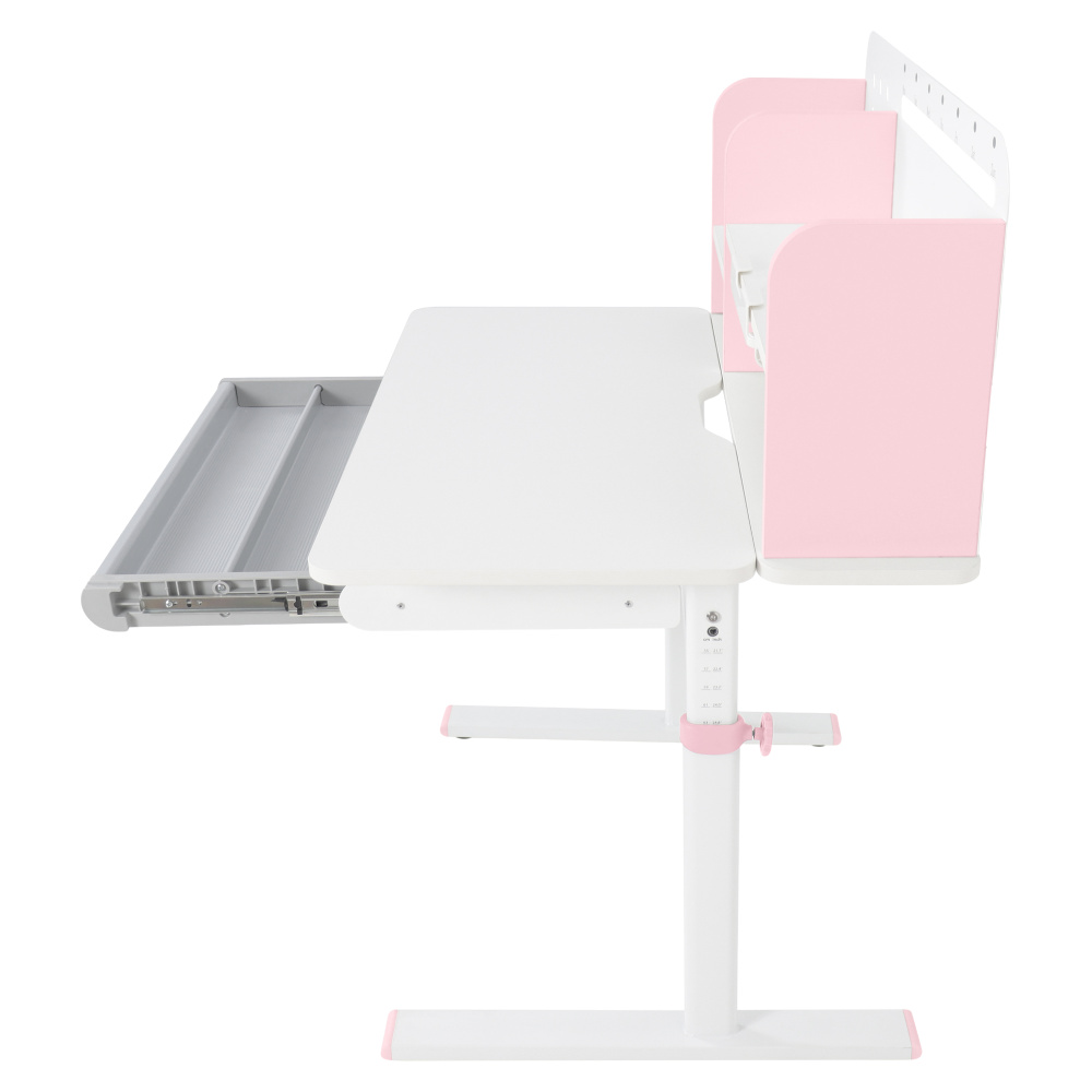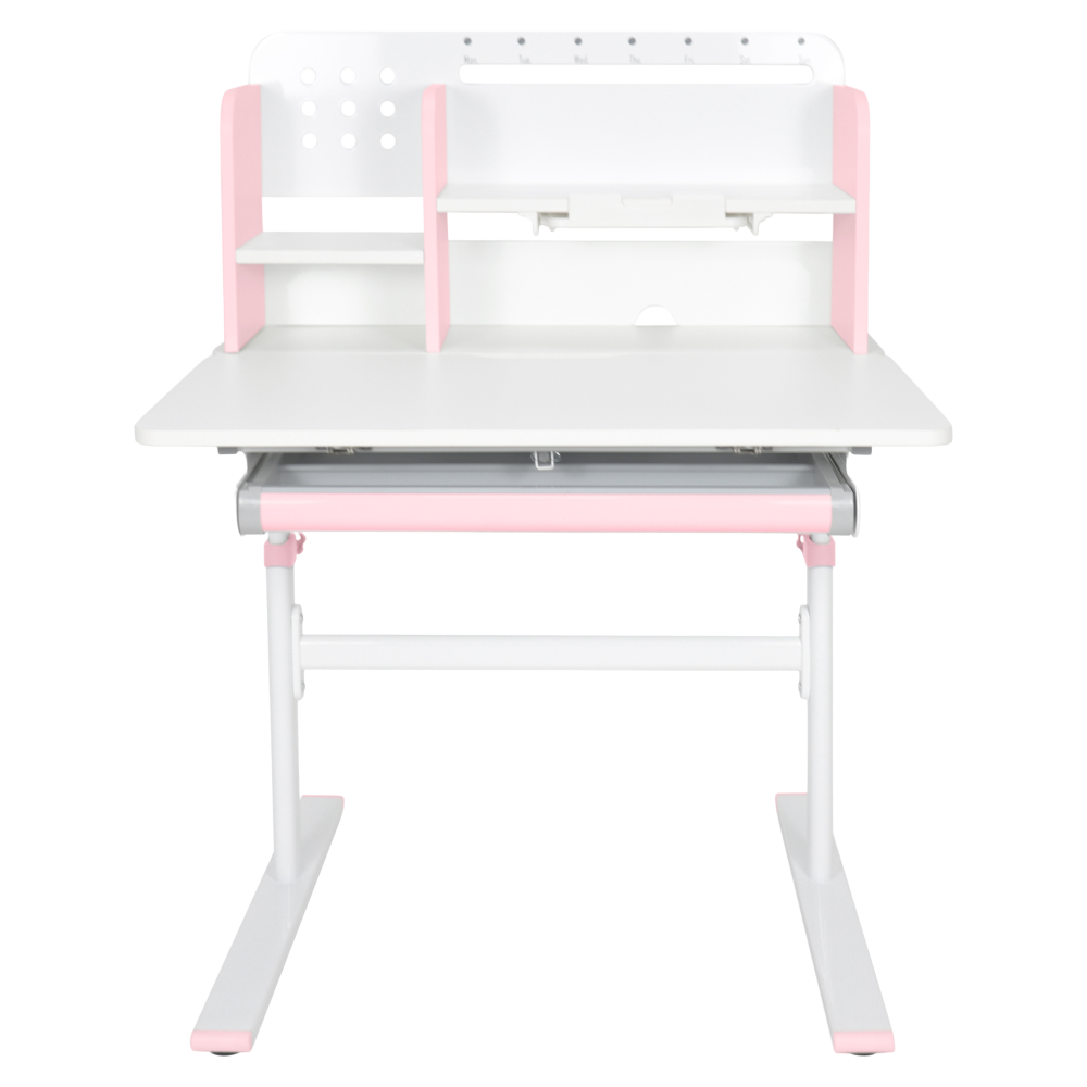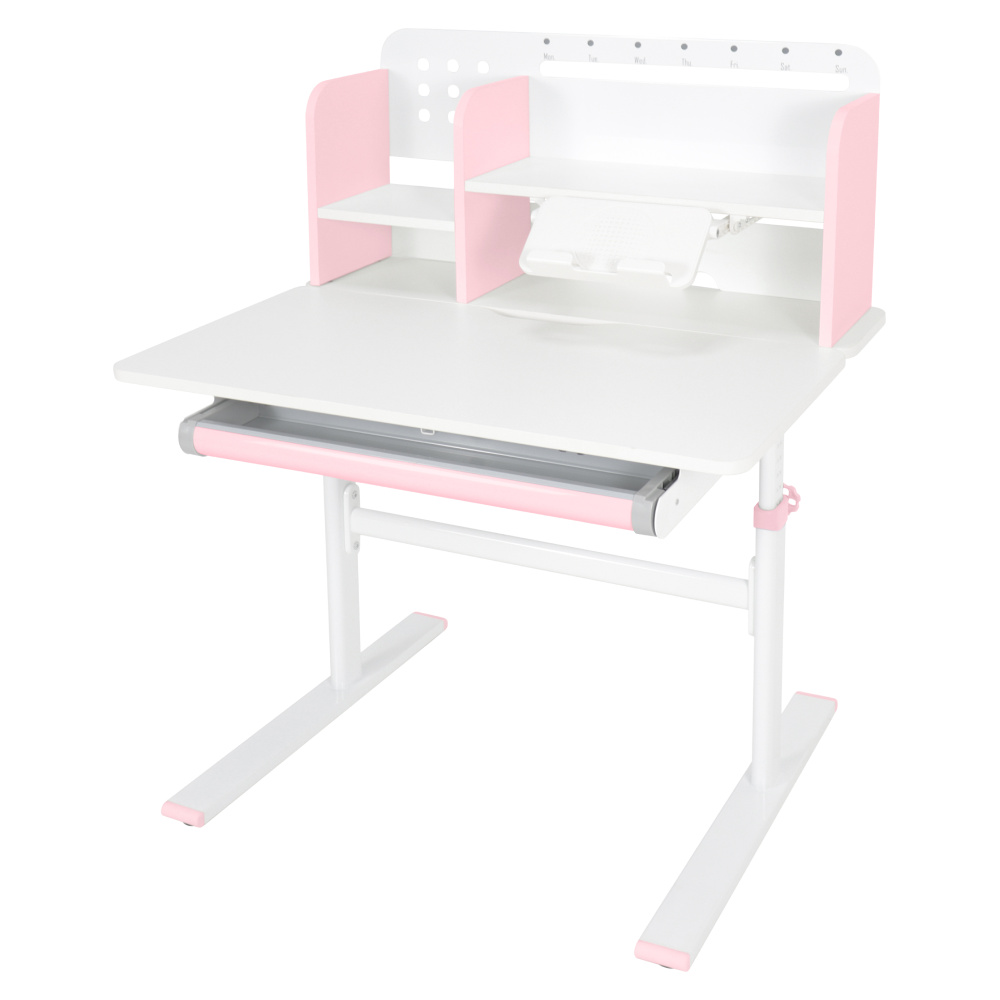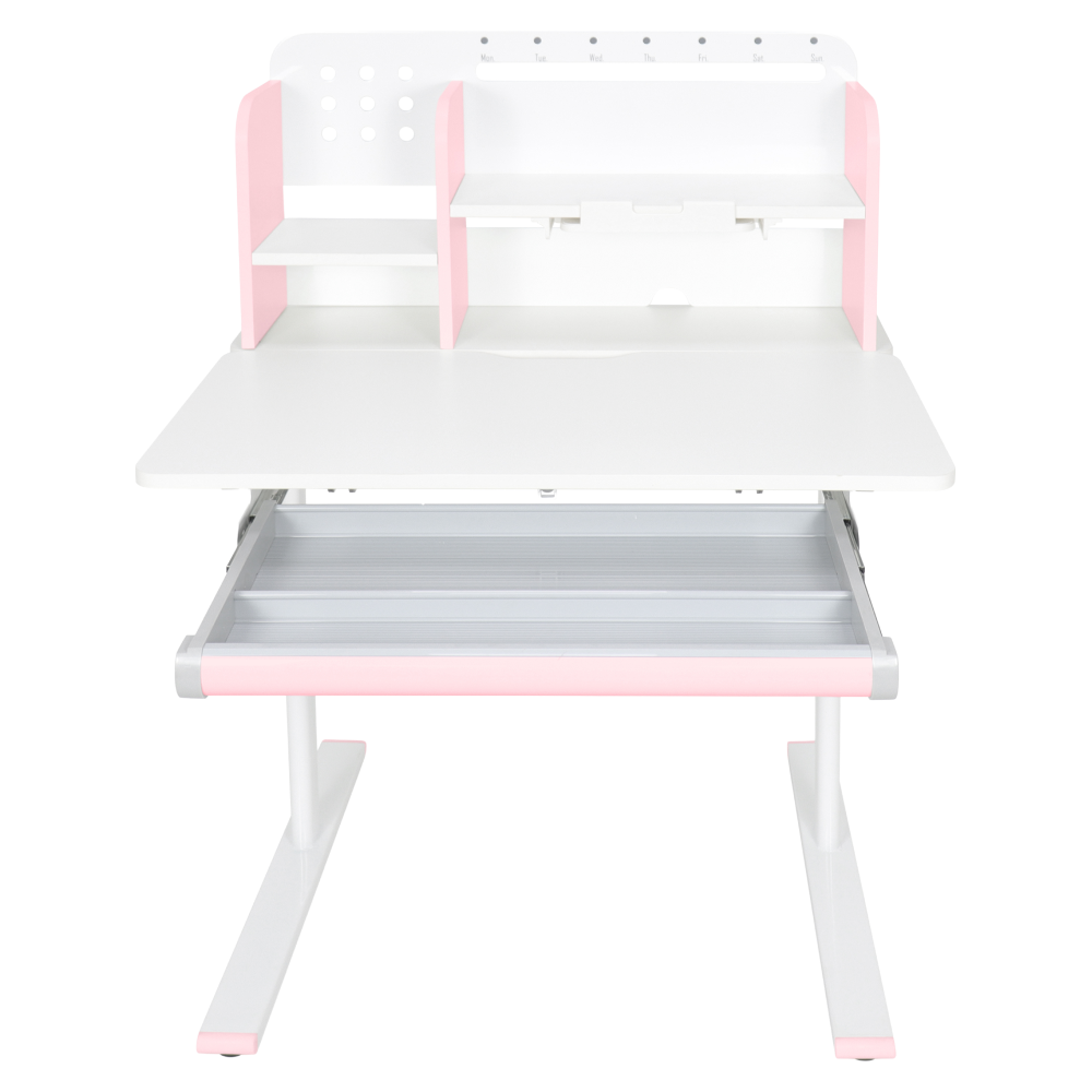 Materiál: laminovaná MDF/plast/kov Barva: růžová/bílá Deska stolu je s PVC hranami Rozměry stolu (ŠxHxV): 80x60x91,5-111,5 cm Šířka podstavy: 68,9 cm Hloubka podstavy: 61 cm Výška pracovní plochy: 56-75 cm Hloubka polohovací části pracovní desky: 40 cm Šířka a výška zadního panelu: 75,6x36,5 cm Šířka menší police: 22 cm Šířka větší police: 49 cm Šířka zásuvky: 60,9 cm Tloušťka materiálu MDF: 1,5 cm Sklon pracovní desky: 0-40° Nastavitelný sklon pracovní desky Nastavitelná výška stolu Plynulé nastavení výšky stolu a úhlu pracovní plochy Manuální nastavení výšky stolu pomocí kliky Kliku lze umístit z pravé nebo z levé strany Nastavení úhlu pracovní plochy pomocí plynového pístu a páčky Prostorná zásuvka s přihrádkou Police na knihy Držák na knihy Lišta s označením dní V zadní části police se nachází otvor pro vedení kabelů Vhodné od 3 do 12 let Pro děti o výšce 100 - 150 cm Dodáváno v demontu