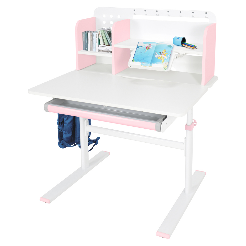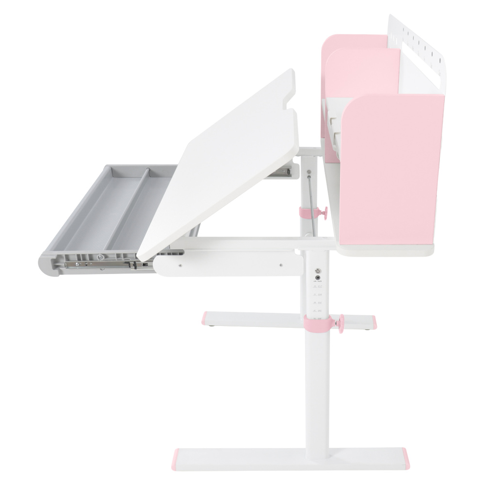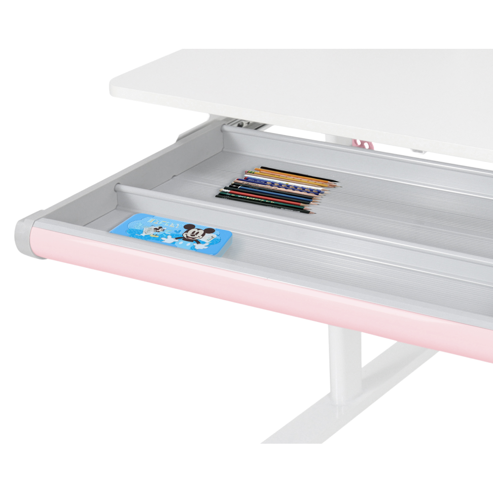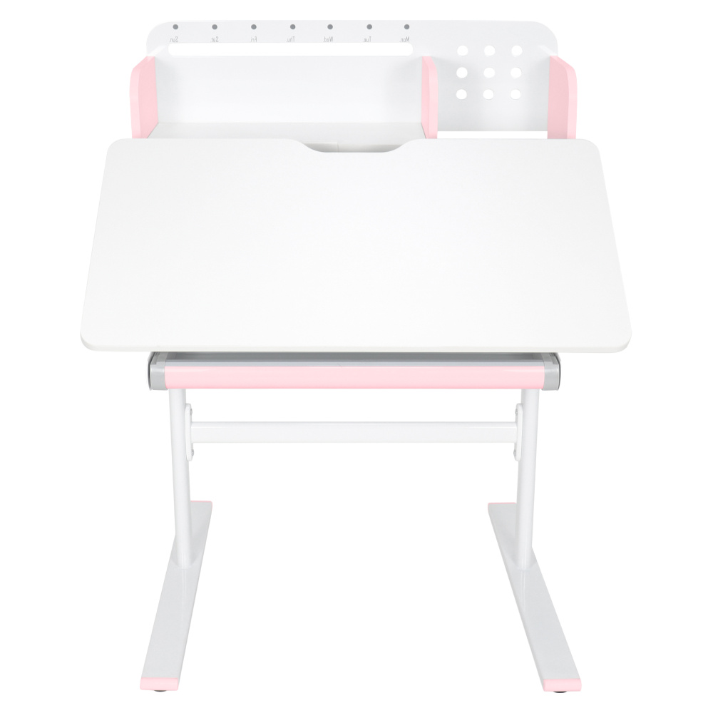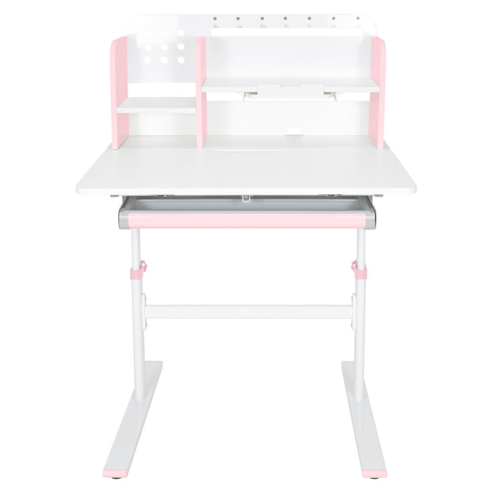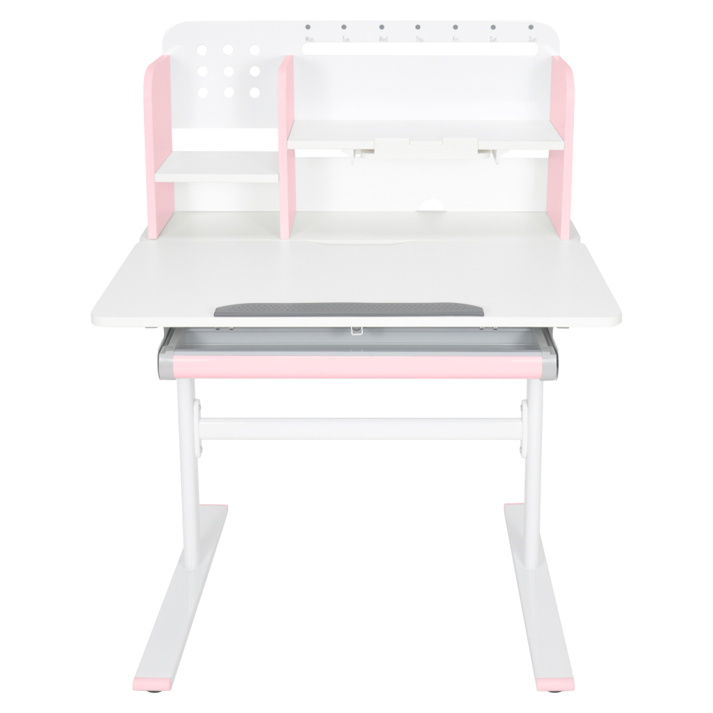 Materiál: laminovaná MDF/plast/kov Barva: růžová/bílá Deska stolu je s PVC hranami Rozměry stolu (ŠxHxV): 80x60x91,5-111,5 cm Šířka podstavy: 68,9 cm Hloubka podstavy: 61 cm Výška pracovní plochy: 56-75 cm Hloubka polohovací části pracovní desky: 40 cm Šířka a výška zadního panelu: 75,6x36,5 cm Šířka menší police: 22 cm Šířka větší police: 49 cm Šířka zásuvky: 60,9 cm Tloušťka materiálu MDF: 1,5 cm Sklon pracovní desky: 0-40° Nastavitelný sklon pracovní desky Nastavitelná výška stolu Plynulé nastavení výšky stolu a úhlu pracovní plochy Manuální nastavení výšky stolu pomocí kliky Kliku lze umístit z pravé nebo z levé strany Nastavení úhlu pracovní plochy pomocí plynového pístu a páčky Prostorná zásuvka s přihrádkou Police na knihy Držák na knihy Lišta s označením dní V zadní části police se nachází otvor pro vedení kabelů Vhodné od 3 do 12 let Pro děti o výšce 100 - 150 cm Dodáváno v demontu