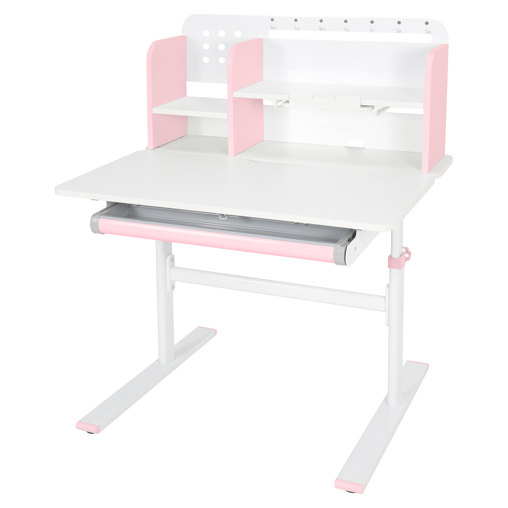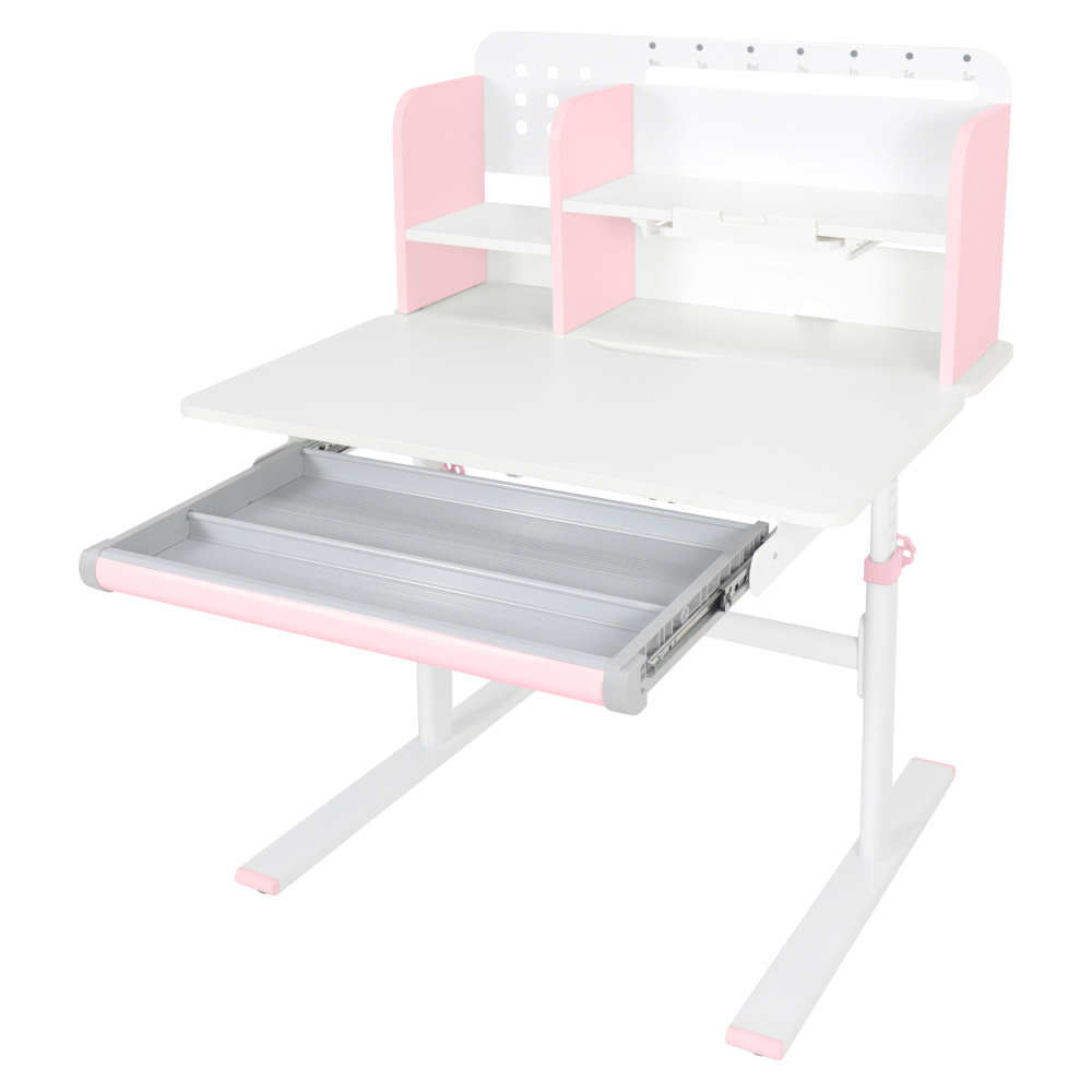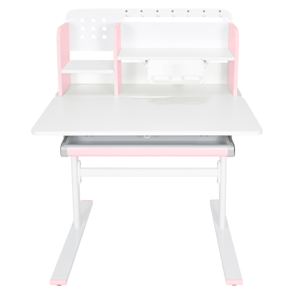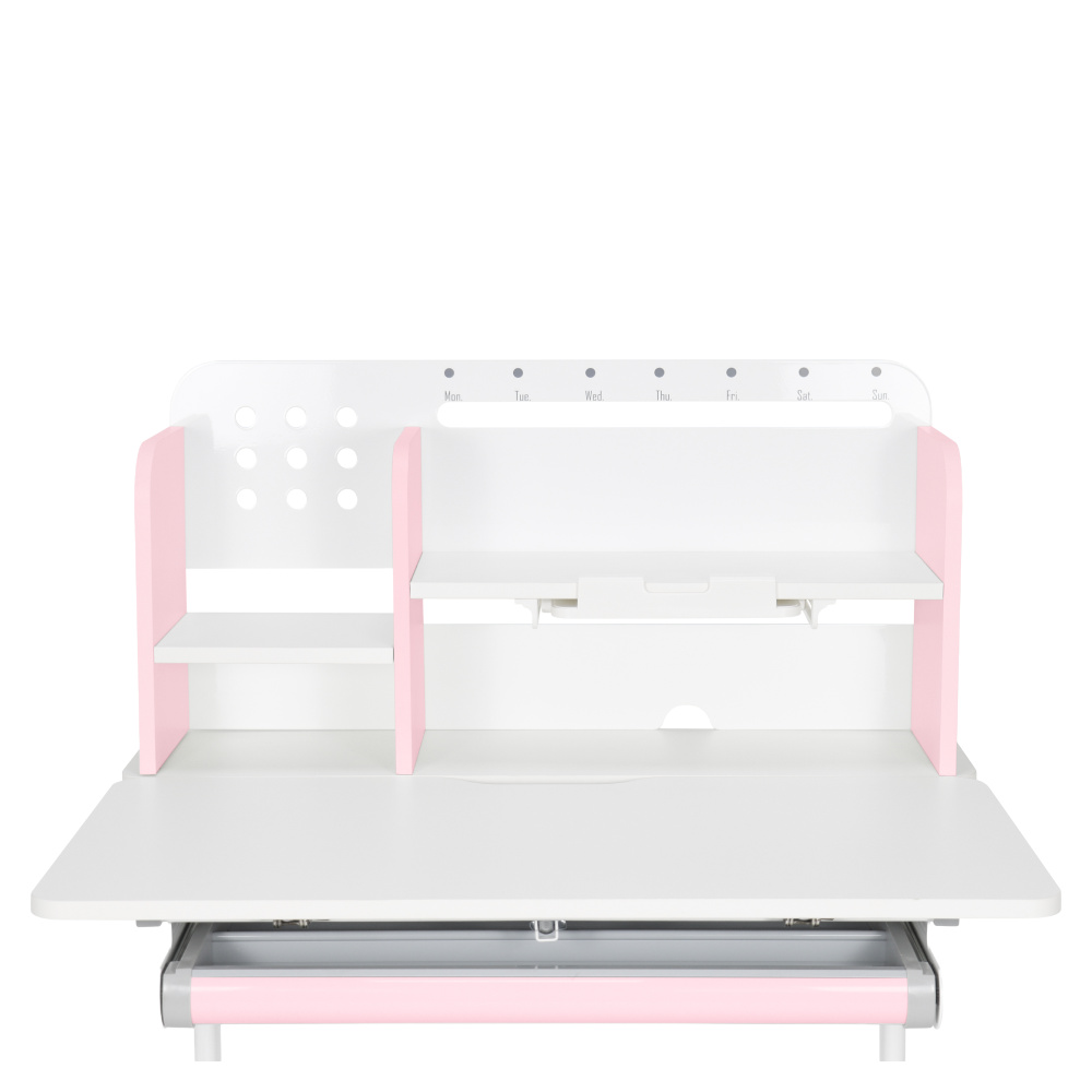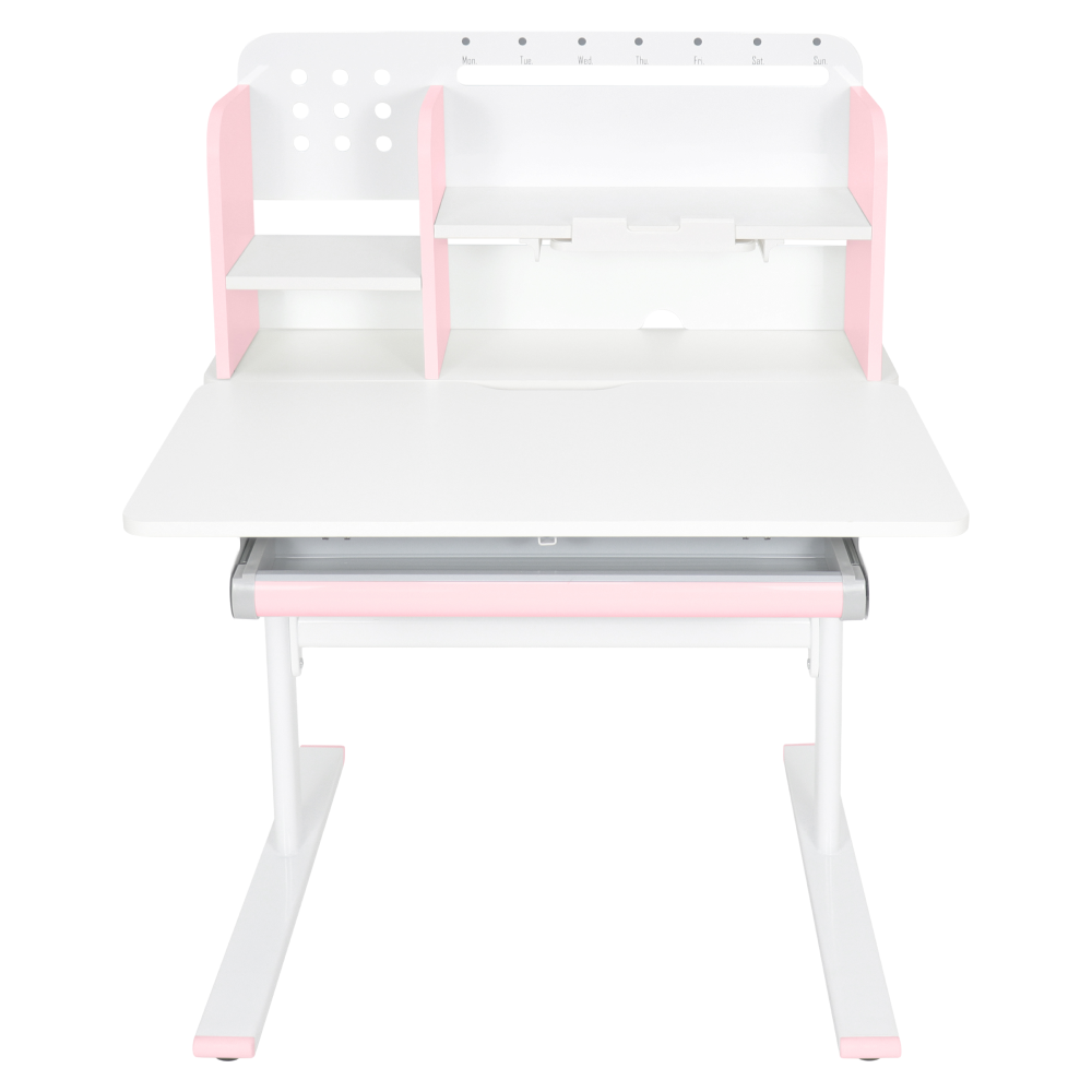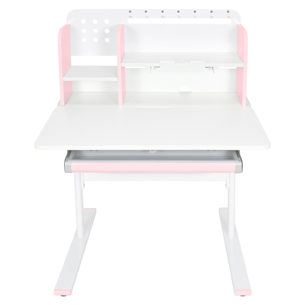 Materiál: laminovaná MDF/plast/kov Barva: růžová/bílá Deska stolu je s PVC hranami Rozměry stolu (ŠxHxV): 80x60x91,5-111,5 cm Šířka podstavy: 68,9 cm Hloubka podstavy: 61 cm Výška pracovní plochy: 56-75 cm Hloubka polohovací části pracovní desky: 40 cm Šířka a výška zadního panelu: 75,6x36,5 cm Šířka menší police: 22 cm Šířka větší police: 49 cm Šířka zásuvky: 60,9 cm Tloušťka materiálu MDF: 1,5 cm Sklon pracovní desky: 0-40° Nastavitelný sklon pracovní desky Nastavitelná výška stolu Plynulé nastavení výšky stolu a úhlu pracovní plochy Manuální nastavení výšky stolu pomocí kliky Kliku lze umístit z pravé nebo z levé strany Nastavení úhlu pracovní plochy pomocí plynového pístu a páčky Prostorná zásuvka s přihrádkou Police na knihy Držák na knihy Lišta s označením dní V zadní části police se nachází otvor pro vedení kabelů Vhodné od 3 do 12 let Pro děti o výšce 100 - 150 cm Dodáváno v demontu