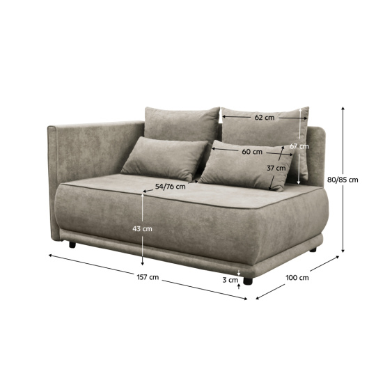 Materiál: látka Gerra 15 Oděruodolnost textilie podle testu Martindale: 40 000 oděrů Barva: béžovošedá Taupe Rozměry (ŠxHxV): 156x103x81/93 cm Plocha na spaní (ŠxD): 94x216 cm Výška sedu: 46 cm Hloubka sedu: 62/93,5 cm Nosnost na osobu: 90 kg Na nožičkách Materiál nožiček: plast Barva nožiček: černá Výška spodního prostoru od podlahy: 3 cm Výplň: pěna T30 Rozkládací Úložný prostor Dodávána s polštáři Rozměry velkých polštářů (ŠxV): 67x62 cm Rozměry menších polštářů (ŠxV): 37x60 cm Levé provedení Praktická Moderní Dodáváno v demontu