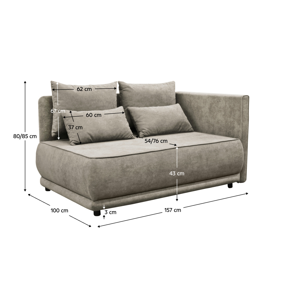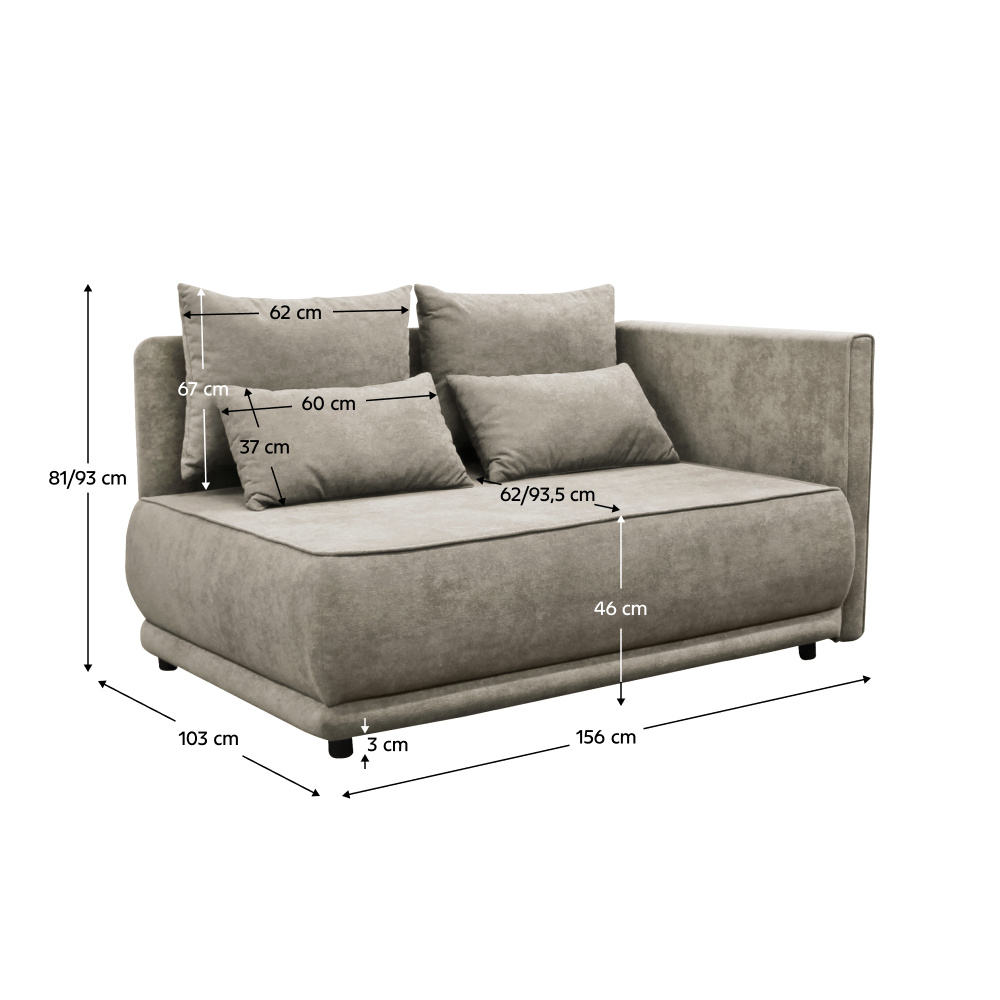Materiál: látka Gerra 15 Oděruodolnost textilie podle testu Martindale: 40 000 oděrů Barva: béžovošedá Taupe Rozměry (ŠxHxV): 156x103x81/93 cm Plocha na spaní (ŠxD): 94x216 cm Výška sedu: 46 cm Hloubka sedu: 62/93,5 cm Nosnost na osobu: 90 kg Na nožičkách Materiál nožiček: plast Barva nožiček: černá Výška spodního prostoru od podlahy: 3 cm Výplň: pěna T30 Rozkládací Úložný prostor Dodávána s polštáři Rozměry velkých polštářů (ŠxV): 67x62 cm Rozměry menších polštářů (ŠxV): 37x60 cm Pravé provedení Praktická Moderní Dodáváno v demontu
