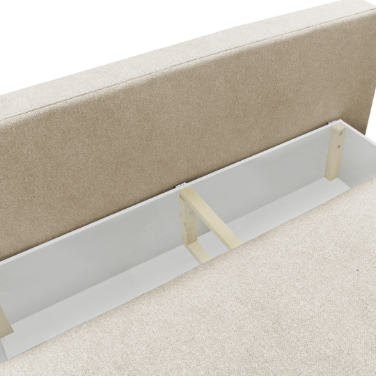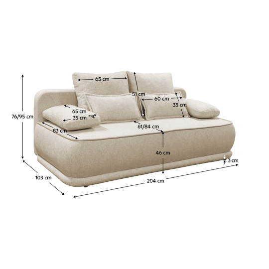 Materiál: látka Blur 1 Oděruodolnost textilie podle testu Martindale: 50 000 oděrů Barva: béžový melír Rozměry (ŠxHxV): 204x103x76/95 cm Plocha na spaní (ŠxD): 151x194 cm Výška sedu: 46 cm Hloubka sedu: 61/84 cm Nosnost na osobu: 90 kg Na nožičkách Materiál nožiček: plast Barva nožiček: černá Výška spodního prostoru od podlahy: 3 cm Výplň: pružina falista/pur pěna Celočalouněná Rozkládací Úložný prostor Dodávána s polštáři Rozměry velkých polštářů (ŠxV): 65x51 cm Rozměry menších polštářů (ŠxV): 60x35 cm Rozměry dekorativních polštářů (ŠxV): 65x35 cm Praktická Moderní Dodáváno v demontu