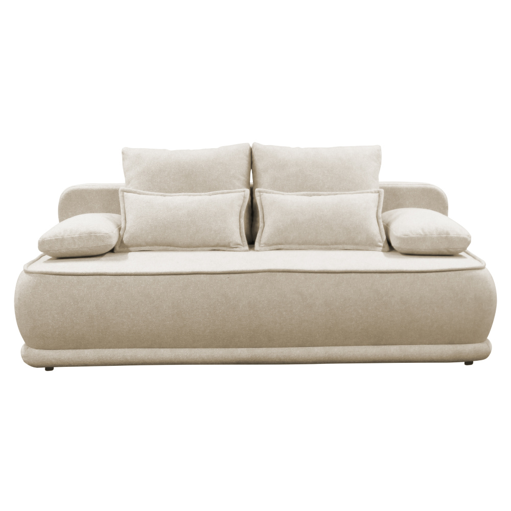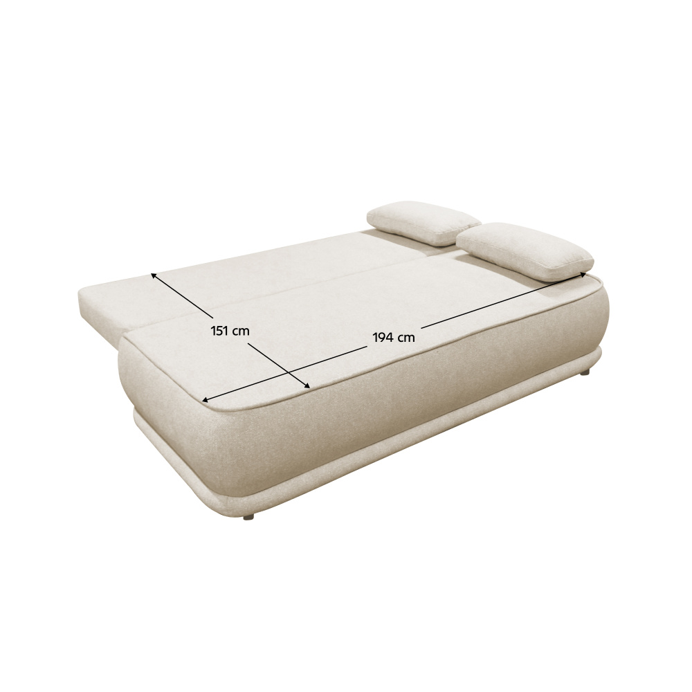 Materiál: látka Blur 1 Oděruodolnost textilie podle testu Martindale: 50 000 oděrů Barva: béžový melír Rozměry (ŠxHxV): 204x103x76/95 cm Plocha na spaní (ŠxD): 151x194 cm Výška sedu: 46 cm Hloubka sedu: 61/84 cm Nosnost na osobu: 90 kg Na nožičkách Materiál nožiček: plast Barva nožiček: černá Výška spodního prostoru od podlahy: 3 cm Výplň: pružina falista/pur pěna Celočalouněná Rozkládací Úložný prostor Dodávána s polštáři Rozměry velkých polštářů (ŠxV): 65x51 cm Rozměry menších polštářů (ŠxV): 60x35 cm Rozměry dekorativních polštářů (ŠxV): 65x35 cm Praktická Moderní Dodáváno v demontu