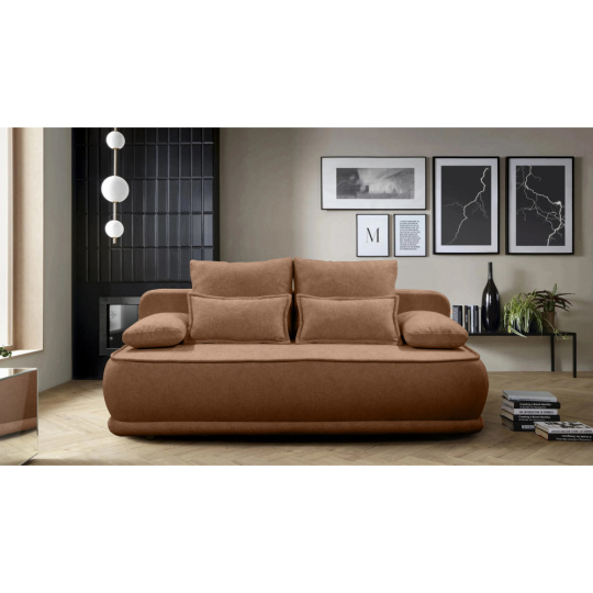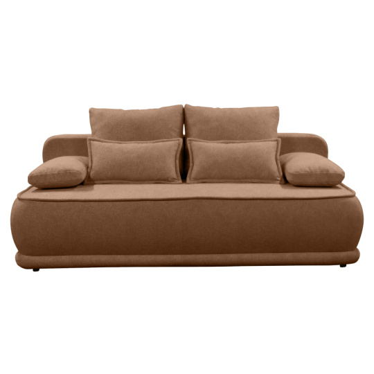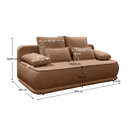 Materiál: látka Blur 5 Oděruodolnost textilie podle testu Martindale: 50 000 oděrů Barva: hnědý melír Rozměry (ŠxHxV): 204x103x76/95 cm Plocha na spaní (ŠxD): 151x194 cm Výška sedu: 46 cm Hloubka sedu: 61/84 cm Nosnost na osobu: 90 kg Na nožičkách Materiál nožiček: plast Barva nožiček: černá Výška spodního prostoru od podlahy: 3 cm Výplň: pružina falista/pur pěna Celočalouněná Rozkládací Úložný prostor Dodávána s polštáři Rozměry velkých polštářů (ŠxV): 65x51 cm Rozměry menších polštářů (ŠxV): 60x35 cm Rozměry dekorativních polštářů (ŠxV): 65x35 cm Praktická Moderní Dodáváno v demontu