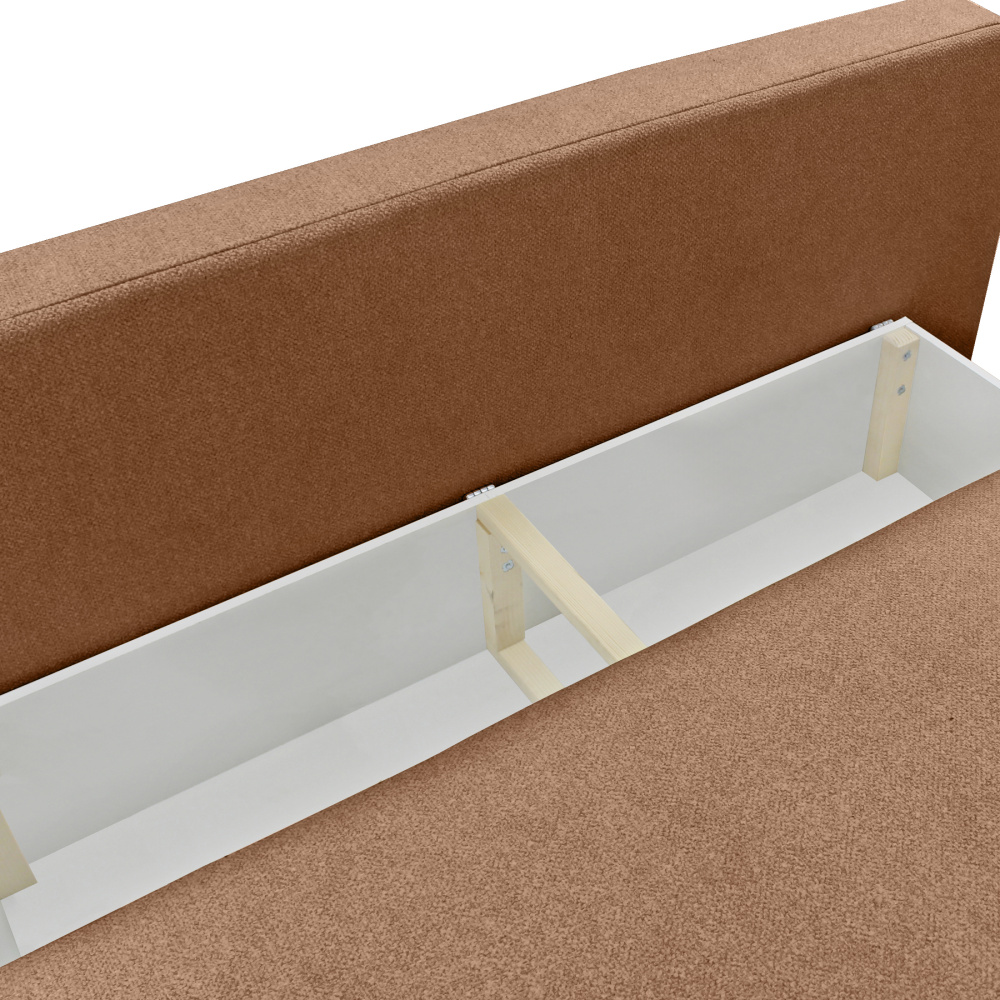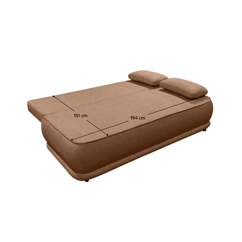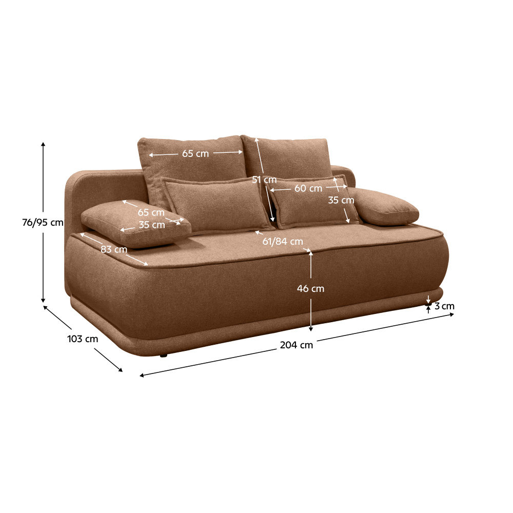 Materiál: látka Blur 5 Oděruodolnost textilie podle testu Martindale: 50 000 oděrů Barva: hnědý melír Rozměry (ŠxHxV): 204x103x76/95 cm Plocha na spaní (ŠxD): 151x194 cm Výška sedu: 46 cm Hloubka sedu: 61/84 cm Nosnost na osobu: 90 kg Na nožičkách Materiál nožiček: plast Barva nožiček: černá Výška spodního prostoru od podlahy: 3 cm Výplň: pružina falista/pur pěna Celočalouněná Rozkládací Úložný prostor Dodávána s polštáři Rozměry velkých polštářů (ŠxV): 65x51 cm Rozměry menších polštářů (ŠxV): 60x35 cm Rozměry dekorativních polštářů (ŠxV): 65x35 cm Praktická Moderní Dodáváno v demontu