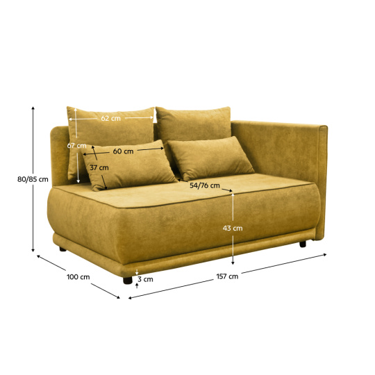 Materiál: látka Gerra 35 Oděruodolnost textilie podle testu Martindale: 40 000 oděrů Barva: hořčicová Rozměry (ŠxHxV): 156x103x81/93 cm Plocha na spaní (ŠxD): 94x216 cm Výška sedu: 46 cm Hloubka sedu: 62/93,5 cm Nosnost na osobu: 90 kg Na nožičkách Materiál nožiček: plast Barva nožiček: černá Výška spodního prostoru od podlahy: 3 cm Výplň: pěna T30 Rozkládací Úložný prostor Dodávána s polštáři Rozměry velkých polštářů (ŠxV): 67x62 cm Rozměry menších polštářů (ŠxV): 37x60 cm Pravé provedení Praktická Moderní Dodáváno v demontu