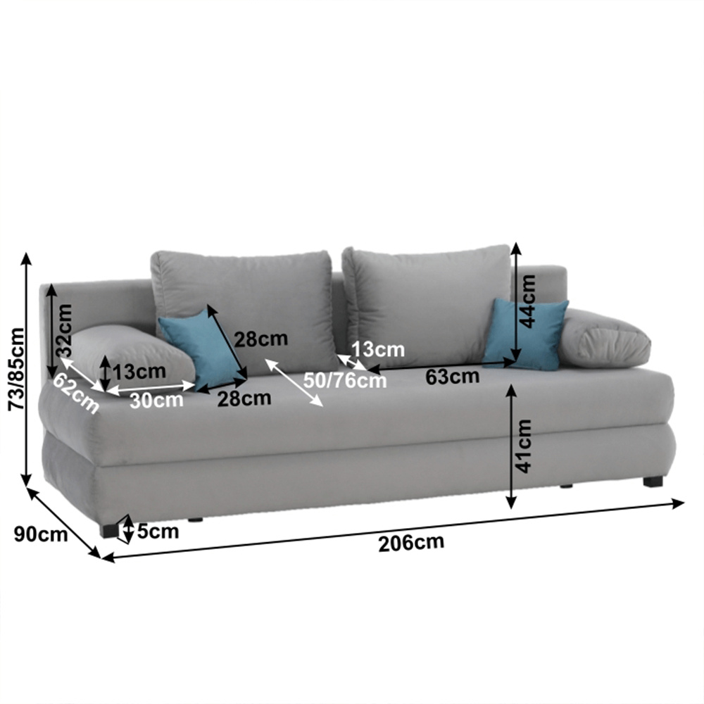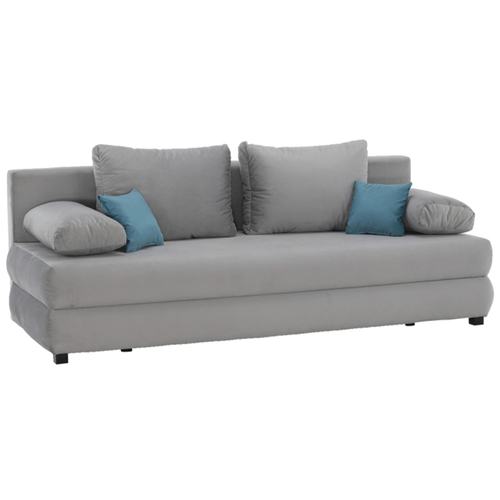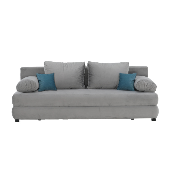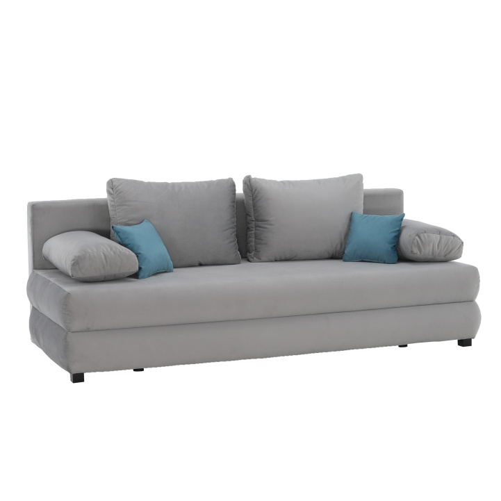 Rozkládací pohovka Clive s úložným prostorem v barevném provedení šedá látka Aria 15 / tyrkysová. Rozměry (ŠxHxV): 206x90x73 / 85 cm Plocha na spaní (ŠxD): 145x200 cm Nosnost na osobu: 90 kg Dodávané s polštáři. Dodávané v demontu.