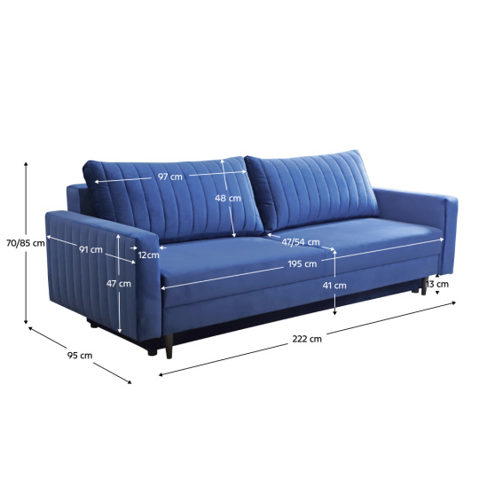 Materiál: látka Kronos 5 Oděruodolnost textilie podle testu Martindale: 60 000 oděrů Barva: modrá Rozměry (ŠxHxV): 222x95x70/85 cm Výška sedu: 41 cm Hloubka sedu: 47/54 cm Plocha na spaní (ŠxD): 140x195 cm Rozměry opěrky na ruce (ŠxHxV): 12x91x47 cm Šířka sedáku: 195 cm Na nožičkách Materiál nožiček: dřevo Barva nožiček: buk Výška nožiček: 13 cm Výplň: pružina typu bonel Celočalouněná Rozkládací S úložným prostorem S polštáři Rozměry polštářů (ŠxV): 97x48 cm Nosnost na osobu: 90 kg Praktická Moderní Dodávána v demontu Nabízíme vám možnost vybrat si ze 4 barevných provedení látky Paros a ze 6 barevných provedení látky Kronos ceně 17 390 Kč. Při individuální objednávce je třeba zaplatit 20% zálohu z dané částky. Po uhrazení zálohy bude Váš požadavek zadán do výroby. Dodací lhůta 6-8 týdnů.