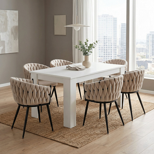 Materiál: DTD laminovaná/ABS hrany Barva: bílá Rozměry (ŠxHxV): 160-210x90x77 cm Rozkládací Vhodný pro 6-8 osob Plastové nožičky Moderní design Dodáváno v demontu
