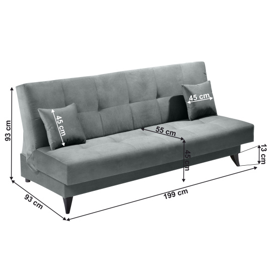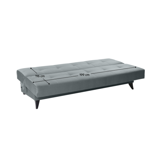 Materiál: látka Asti 23 Oděruodolnost textilie podle testu Martindale: 90 000 oděrů Barva: šedá Rozměry (ŠxHxV): 199x91x92 cm Plocha na spaní (ŠxD): 116x199 cm Výška sedu: 46 cm Hloubka sedu: 55 cm Rozkládací S úložným prostorem Nosnost na osobu: 90 kg Výška spodního prostoru od podlahy: 13 cm 2 dekorativní polštářky Rozměr polštářů (ŠxH): 37x37 cm Plastové nožičky Barva nožiček: černá Výplň: bonelová pružina/pur pěna Dodáváno v demontu