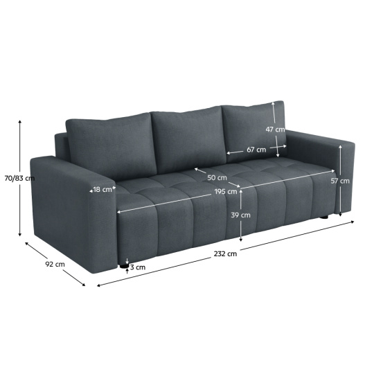 Matariál: látka Paros 06 Oděruodolnost textilie podle testu Martindale: 50 000 oděrů Barva: šedá Rozměry (ŠxHxV): 232x92x70/83 cm Plocha na spaní (ŠxH): 138x195 cm Hloubka sedu: 50 cm Výška sedu: 39 cm Šířka sedu: 195 cm Výška opěrky na ruku: 57 cm Šířka opěrky na ruku: 18 cm Nosnost na osobu: 90 kg Plastové nožičky Barva nožiček: černá Výška nožiček: 3 cm Celočalouněná Rozkládací S úložným prostorem Dodávána s polštáři Rozměry polštáře (ŠxV): 67x47 cm Výplň: pružina typu bonel Praktická Moderní Dodáváno v demontu Možnost objednání ve 4 barevných provedeních látky Paros a v 6 barevných provedeních látky Kronos ceně 16.990 Kč s dodací lhůtou 6-8 týdnů. Při individuální objednávce je třeba zaplatit 20% zálohu z dané částky. Po uhrazení zálohy bude Váš požadavek zadán do výroby.