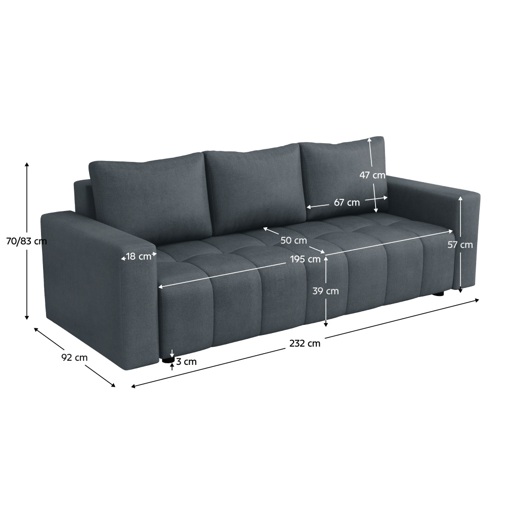 Matariál: látka Paros 06 Oděruodolnost textilie podle testu Martindale: 55 000 oděrů Barva: šedá Rozměry (ŠxHxV): 232x92x70/83 cm Plocha na spaní (ŠxH): 138x195 cm Hloubka sedu: 50 cm Výška sedu: 39 cm Šířka sedu: 195 cm Výška opěrky na ruku: 57 cm Šířka opěrky na ruku: 18 cm Nosnost na osobu: 90 kg Plastové nožičky Barva nožiček: černá Výška nožiček: 3 cm Celočalouněná Rozkládací S úložným prostorem Dodávána s polštáři Rozměry polštáře (ŠxV): 67x47 cm Výplň: pružina typu bonel Praktická Moderní Dodáváno v demontu Možnost objednání ve 4 barevných provedeních látky Paros a v 6 barevných provedeních látky Kronos ceně 16.990 Kč s dodací lhůtou 6-8 týdnů. Při individuální objednávce je třeba zaplatit 20% zálohu z dané částky. Po uhrazení zálohy bude Váš požadavek zadán do výroby.