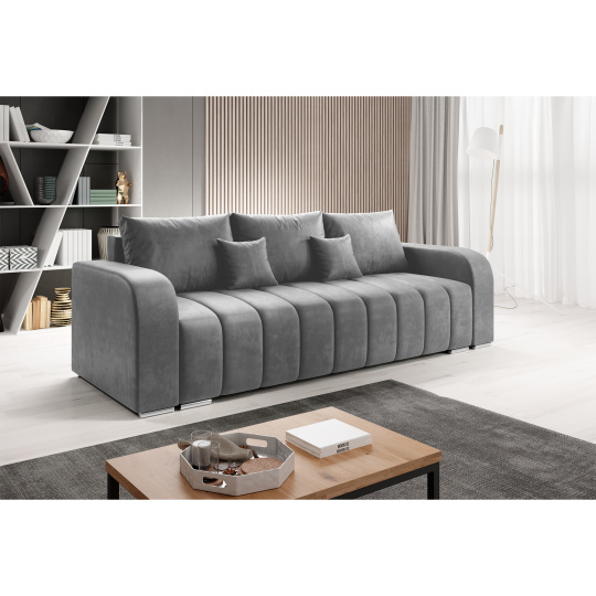 Materiál čalounění: Monolith 37 Oděruodolnost látky podle testu Martindale: 100 000 Barva čalounění: šedá Rozměry (ŠxHxV): 245x90x86 cm Plocha na spaní (ŠxD): 140x200 cm Výška sedu: 47 cm Hloubka sedu: 57 cm Na nožičkách Materiál nožiček: plast Barva nožiček: stříbrná Výška spodního prostoru od podlahy: 3 cm Nosnost na osobu: 90 kg Výplň: bonelová pružina+Pur pěna Rozkládací Celočalouněná Dekorativní prošití Voděodolný materiál S úložným prostorem Dodávána s polštáři 3 velké polštáře 2 malé polštáře Rozměry velkých polštářů (ŠxV): 67x50 cm Rozměry malých polštářů (ŠxV): 38x38 cm Dodáváno v demontu