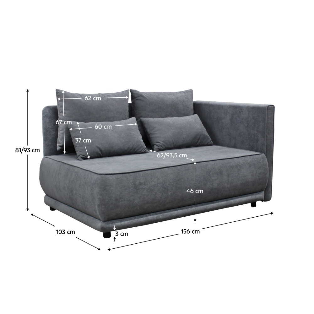 Materiál: látka Gerra 70 Oděruodolnost textilie podle testu Martindale: 40 000 oděrů Barva: šedá Rozměry (ŠxHxV): 156x103x81/93 cm Plocha na spaní (ŠxD): 94x216 cm Výška sedu: 46 cm Hloubka sedu: 62/93,5 cm Nosnost na osobu: 90 kg Na nožičkách Materiál nožiček: plast Barva nožiček: černá Výška spodního prostoru od podlahy: 3 cm Výplň: pěna T30 Rozkládací Úložný prostor Dodávána s polštáři Rozměry velkých polštářů (ŠxV): 67x62 cm Rozměry menších polštářů (ŠxV): 37x60 cm Pravé provedení Praktická Moderní Dodáváno v demontu