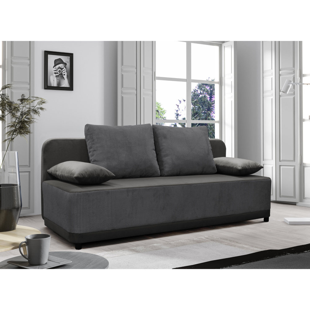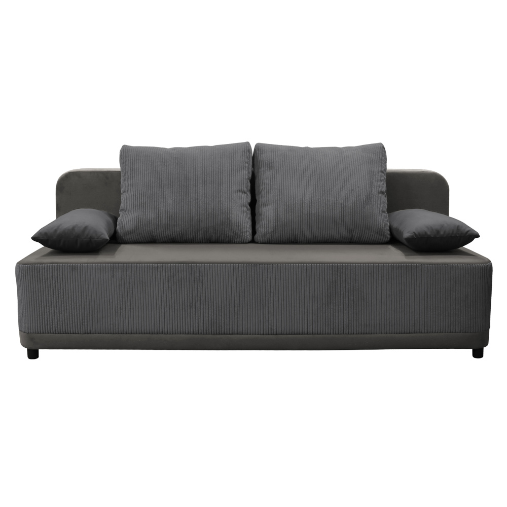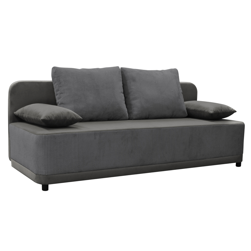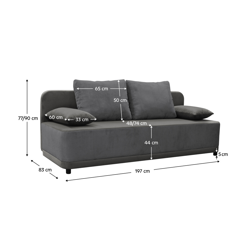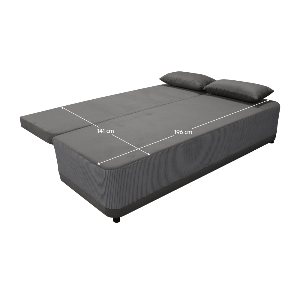 Materiál: látka Manila 16/Poso 60 Oděruodolnost textilie Manila podle testu Martindale: 58 000 oděrů Oděruodolnost textilie Poso podle testu Martindale: 90 000 oděrů Barva: šedá Rozměry (ŠxHxV): 197x83x77/90 cm Plocha na spaní (ŠxD): 141x196 cm Výška sedu: 44 cm Hloubka sedu: 48/74 cm Materiál nožiček: plast Barva nožiček: černá Výška spodního prostoru od podlahy: 5 cm Výplň: pur pěna Celočalouněná Rozkládací Úložný prostor Dodávána s polštáři Rozměry velkého polštáře (ŠxV): 65x50 cm Rozměry malého polštáře (ŠxH): 33x60 cm Nosnost na osobu: 90 kg Praktická Moderní Dodáváno v demontu