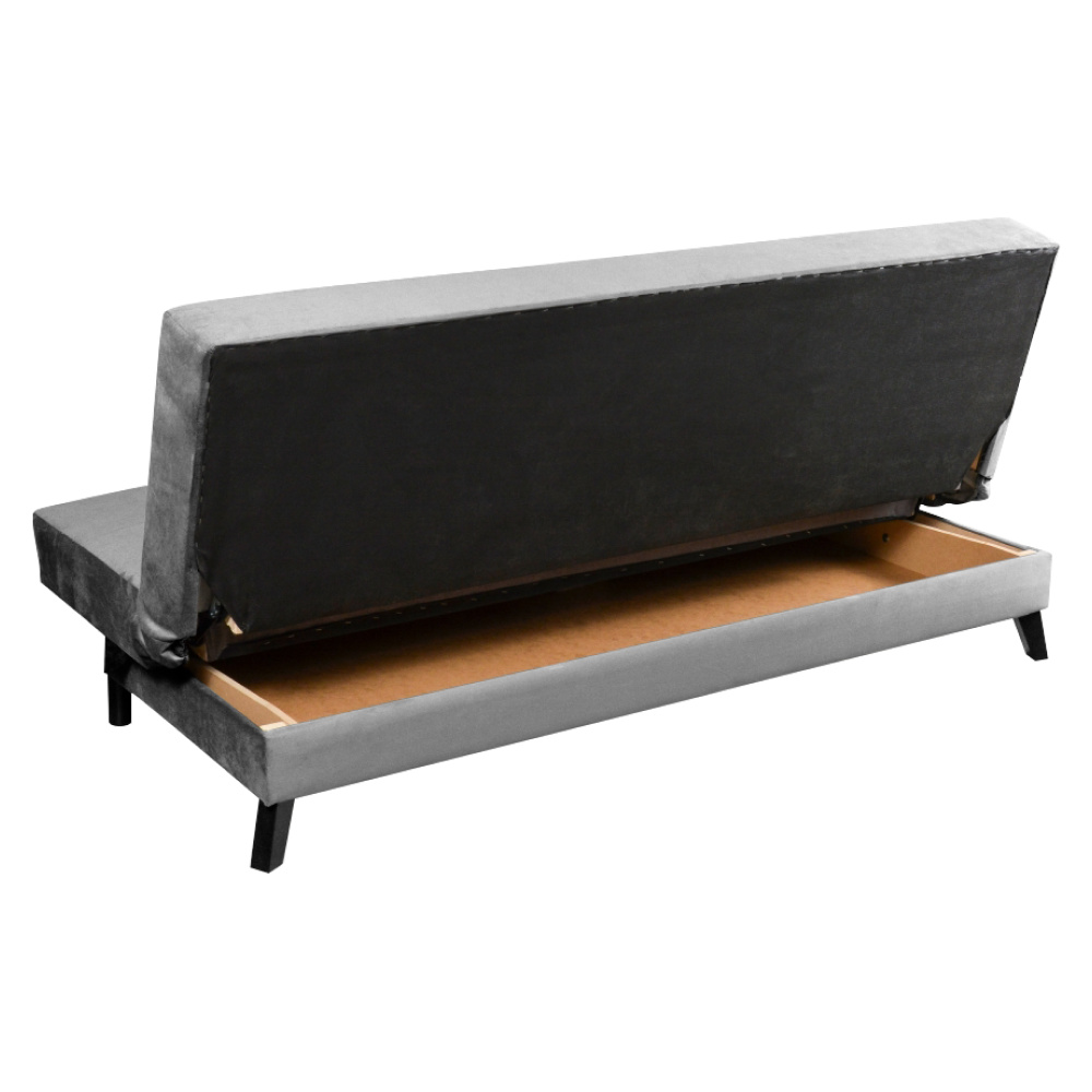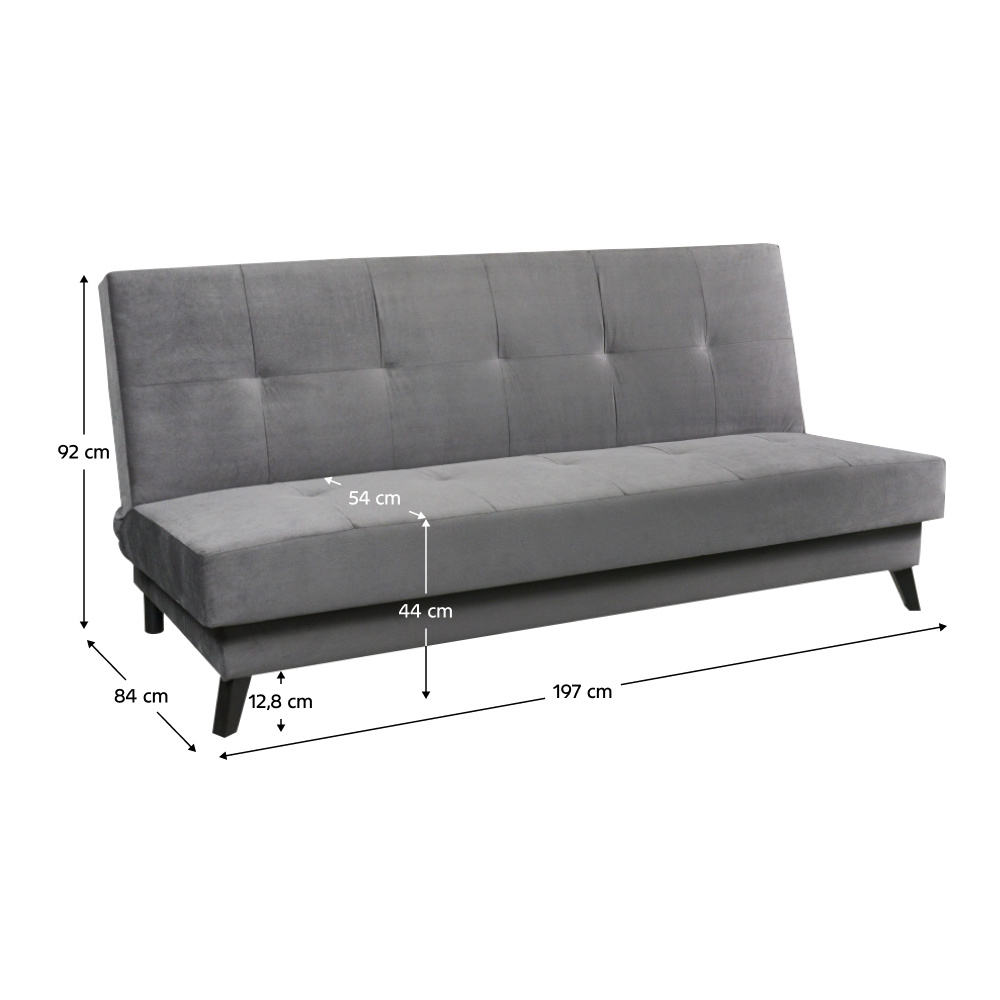Materiál: látka Trinity 15 Oděruodolnost textilie podle testu Martindale: 55 000 oděrů Barva: šedá Rozměry (ŠxHxV): 197x84x92 cm Plocha na spaní (ŠxD): 118x197 cm Výška sedu: 44 cm Hloubka sedu: 54 cm Nosnost na osobu: 90 kg Jádro sezení: pružina falista/pur pěna Na nožičkách Materiál nožiček: dřevo Barva nožiček: černá Výška spodního prostoru od podlahy: 12,8 cm Rozkládací Úložný prostor Voděodolná látka Dodáváno v demontu.