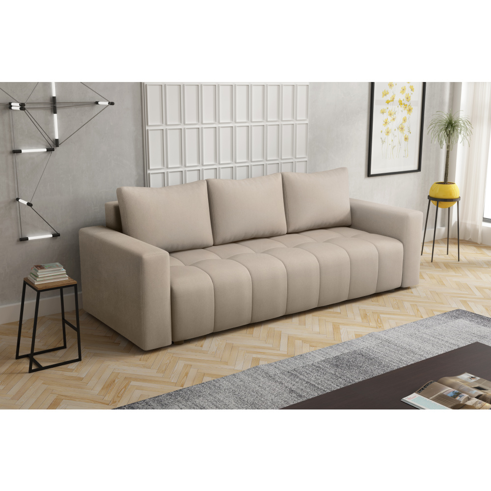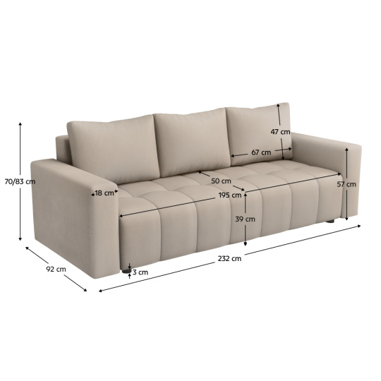 Matariál: látka Paros 02 Oděruodolnost textilie podle testu Martindale: 50 000 oděrů Barva: šedobéžová Rozměry (ŠxHxV): 232x92x70/83 cm Plocha na spaní (ŠxH): 138x195 cm Hloubka sedu: 50 cm Výška sedu: 39 cm Šířka sedu: 195 cm Výška opěrky na ruku: 57 cm Šířka opěrky na ruku: 18 cm Nosnost na osobu: 90 kg Plastové nožičky Barva nožiček: černá Výška nožiček: 3 cm Celočalouněná Rozkládací S úložným prostorem Dodávána s polštáři Rozměry polštáře (ŠxV): 67x47 cm Výplň: pružina typu bonel Praktická Moderní Dodáváno v demontu Možnost objednání ve 4 barevných provedeních látky Paros a v 6 barevných provedeních látky Kronos ceně 16.990 Kč s dodací lhůtou 6-8 týdnů. Při individuální objednávce je třeba zaplatit 20% zálohu z dané částky. Po uhrazení zálohy bude Váš požadavek zadán do výroby.