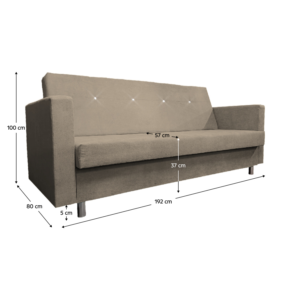 Materiál: látka Manila 05/Poso 03 Oděruodolnost textilie Manila podle testu Martindale: 58 000 oděrů Oděruodolnost textilie Poso podle testu Martindale: 90 000 oděrů Barva: šedobéžová Taupe Rozměry (ŠxHxV): 197x83x77/90 cm Plocha na spaní (ŠxD): 141x196 cm Výška sedu: 44 cm Hloubka sedu: 48/74 cm Materiál nožiček: plast Barva nožiček: černá Výška spodního prostoru od podlahy: 5 cm Výplň: pur pěna Celočalouněná Rozkládací Úložný prostor Dodávána s polštáři Rozměry velkého polštáře (ŠxV): 65x50 cm Rozměry malého polštáře (ŠxH): 33x60 cm Nosnost na osobu: 90 kg Praktická Moderní Dodáváno v demontu