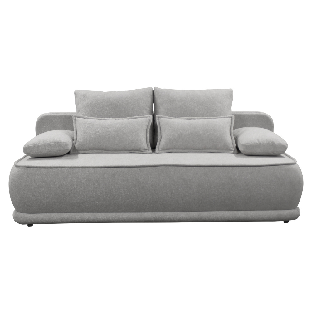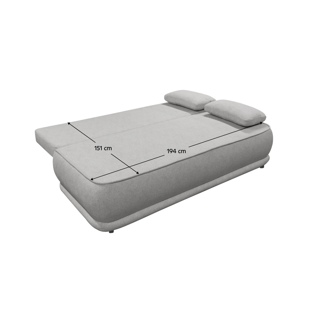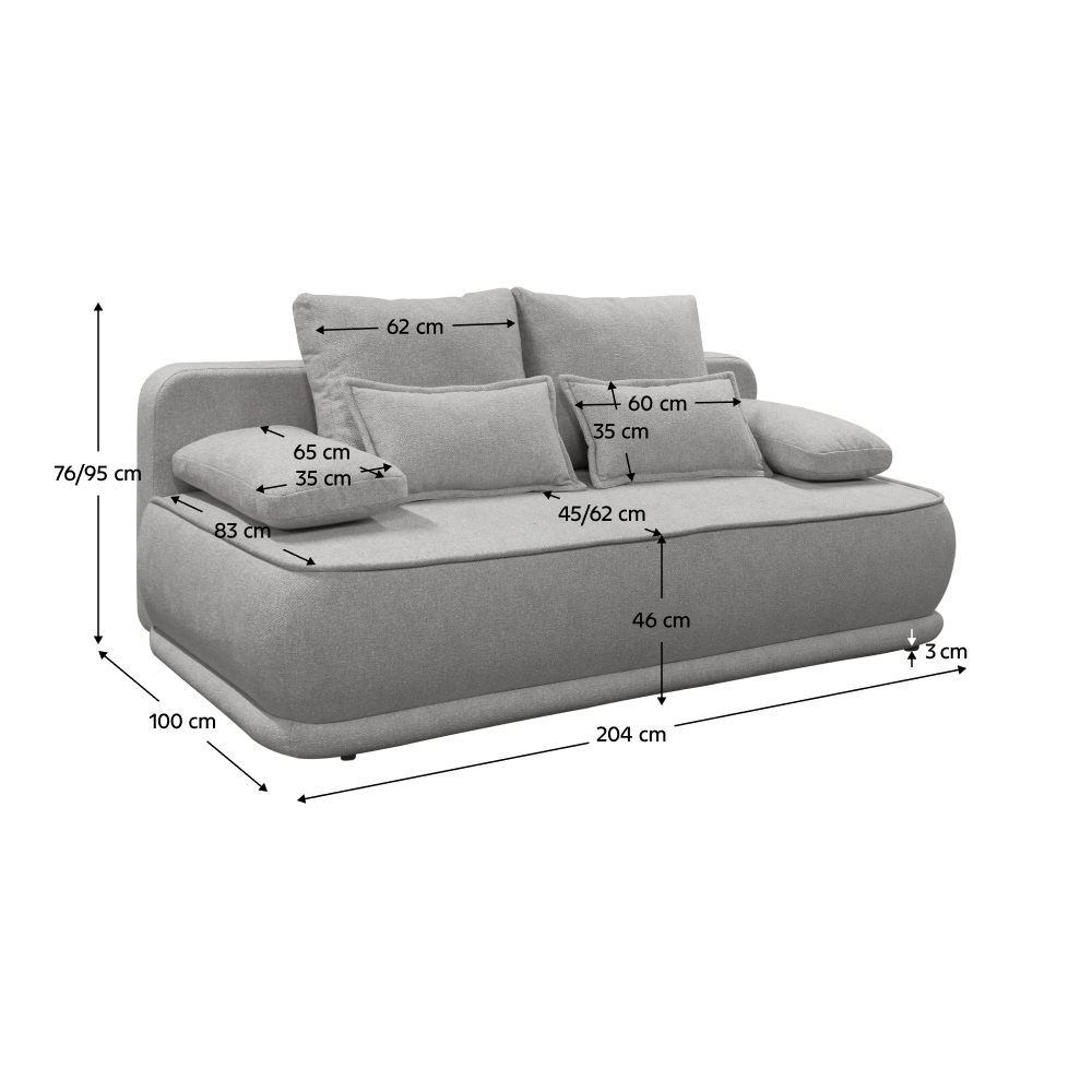 Materiál: látka Blur 18 Oděruodolnost textilie podle testu Martindale: 50 000 oděrů Barva: šedý melír Rozměry (ŠxHxV): 204x103x76/95 cm Plocha na spaní (ŠxD): 151x194 cm Výška sedu: 46 cm Hloubka sedu: 61/84 cm Nosnost na osobu: 90 kg Na nožičkách Materiál nožiček: plast Barva nožiček: černá Výška spodního prostoru od podlahy: 3 cm Výplň: pružina falista/pur pěna Celočalouněná Rozkládací Úložný prostor Dodávána s polštáři Rozměry velkých polštářů (ŠxV): 65x51 cm Rozměry menších polštářů (ŠxV): 60x35 cm Rozměry dekorativních polštářů (ŠxV): 65x35 cm Praktická Moderní Dodáváno v demontu