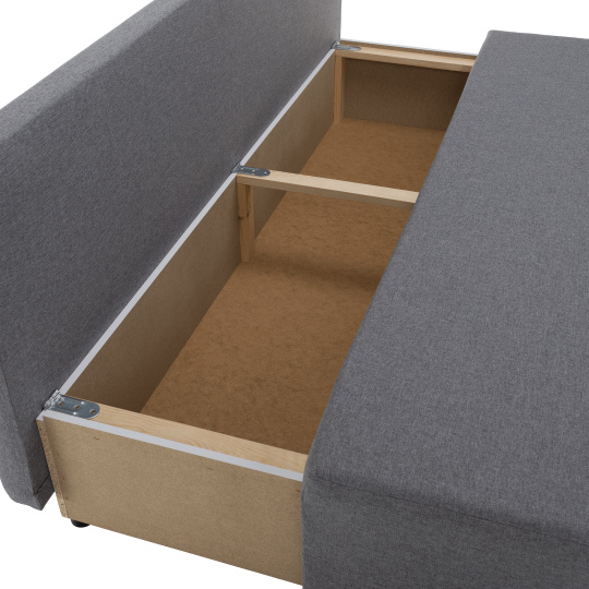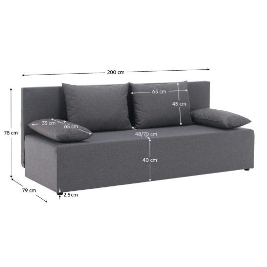 Materiál: látka Malmo 90 Oděruodolnost textilie podle testu Martindale: 30 000 oděrů Barva: světle šedá Rozměry (ŠxHxV): 200x79x78 cm Plocha na spaní (ŠxD): 140x200 cm Výška sedu: 40 cm Hloubka sedu: 48/70 cm Na nožičkách Materiál nožiček: plast Barva nožiček: černá Výška spodního prostoru od podlahy: 2,5 cm Výplň: pur pěna T28 Čalouněná Rozkládací Úložný prostor Dodávána s polštáři Rozměry velkého polštáře (ŠxV): 65x45 cm Rozměry malého polštáře (ŠxH):35x65 cm Nosnost na osobu: 90 kg Praktická Moderní Dodáváno v demontu