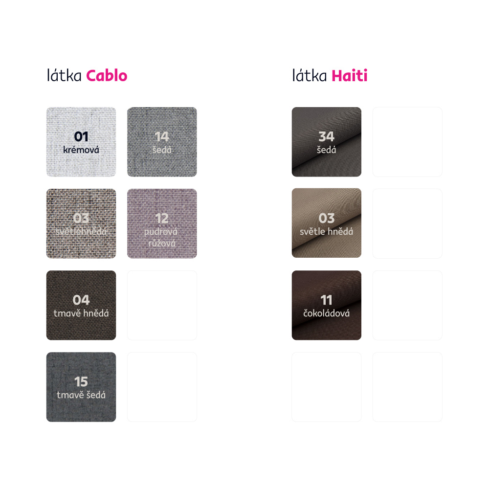;"Materiál: látka Cable Oděruodolnost textilie podle testu Martindale: 72 000 oděrek Barva: světlemodrá 11 Rozměry (ŠxHxV): 149x90x80 cm Plocha na spaní (ŠxD): 80x195 cm Výška sedu: 40 cm Hloubka sedu: 83 cm Výška spodního prostoru od podlahy: 10 cm rozkládací S úložným prostorem Bonelové výplň sedáku dva polštáře levé provedení Nosnost na osobu: 90 kg Dodávané v demontu Možnost objednání ve 3 barevných provedeních látky Haiti nebo v 6 barevných provedeních látky Cablo, v ceně: 10.290,-Kč, dodací lhůta 6-8 týdnů. Při individuální objednávce je třeba zaplatit 20% zálohu z dané částky. Po uhrazení zálohy bude Vaša objednávka zadána do výroby.