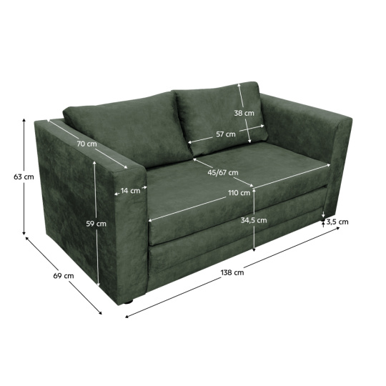 Materiál: látka ENJOY 47/sosna Oděruodolnost textilie podle testu Martindale: 45 000 oděrů Barva: zelená Rozměry (ŠxHxV): 138x69x63 cm Plocha na spaní (ŠxD): 110x198 cm Výška sedu: 34,5 cm Hloubka sedu s polštářem: 45 cm Hloubka sedu bez polštáře : 67 cm Šířka sedu: 100 cm Výška spaní: 13 cm Tloušťka materiálu konstrukce: 2,2 cm Rozměry opěrky na ruku (ŠxHxV): 14x70x59 cm Na nožičkách Materiál nožiček: plast Barva nožiček: černá Výška spodního prostoru od podlahy: 3,5 cm Výplň: pěna PU Tvrdost: T25 Celočalouněná Rozkládací S polštáři Rozměry polštářů (ŠxV): 57x38 cm Nosnost: 100 kg Hmotnost: 35 kg Praktická Moderní Dodávána v demontu