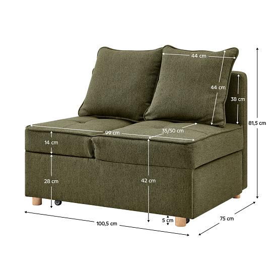 Materiál: látka Neve 39/dřevo/kov Oděruodolnost látky podle testu Martindale: 80 000 oděrů Barva: zelená Rozměry (ŠxHxV): 100,5x75x81,5 cm Plocha na spaní (ŠxD): 66x184 cm Výška sedu: 42 cm Výška sedu bez matrace: 28 cm Hloubka sedu: 35 cm Hloubka sedu bez polštářů: 50 cm Šířka sedu: 99 cm Šířka po rozložení: 184 cm Výška zádové opěrky: 38 cm Šířka zádové opěrky: 99 cm Výška matrace: 14 cm Nosnost: 90 kg na osobu Výplň: molitán Na nožičkách Materiál nožiček: bukové dřevo Barva nožiček: přírodní Výška spodního prostoru od podlahy: 5 cm 2-sed Pohovka Celočalouněná Rozkládací Polohovatelná opěrka hlavy 5 stupňů polohování Dodávána s polštáři Rozměry polštářů (ŠxHxV): 44x15x44 cm Dekorativní prošití Praktická Moderní design Dodáváno v demontu