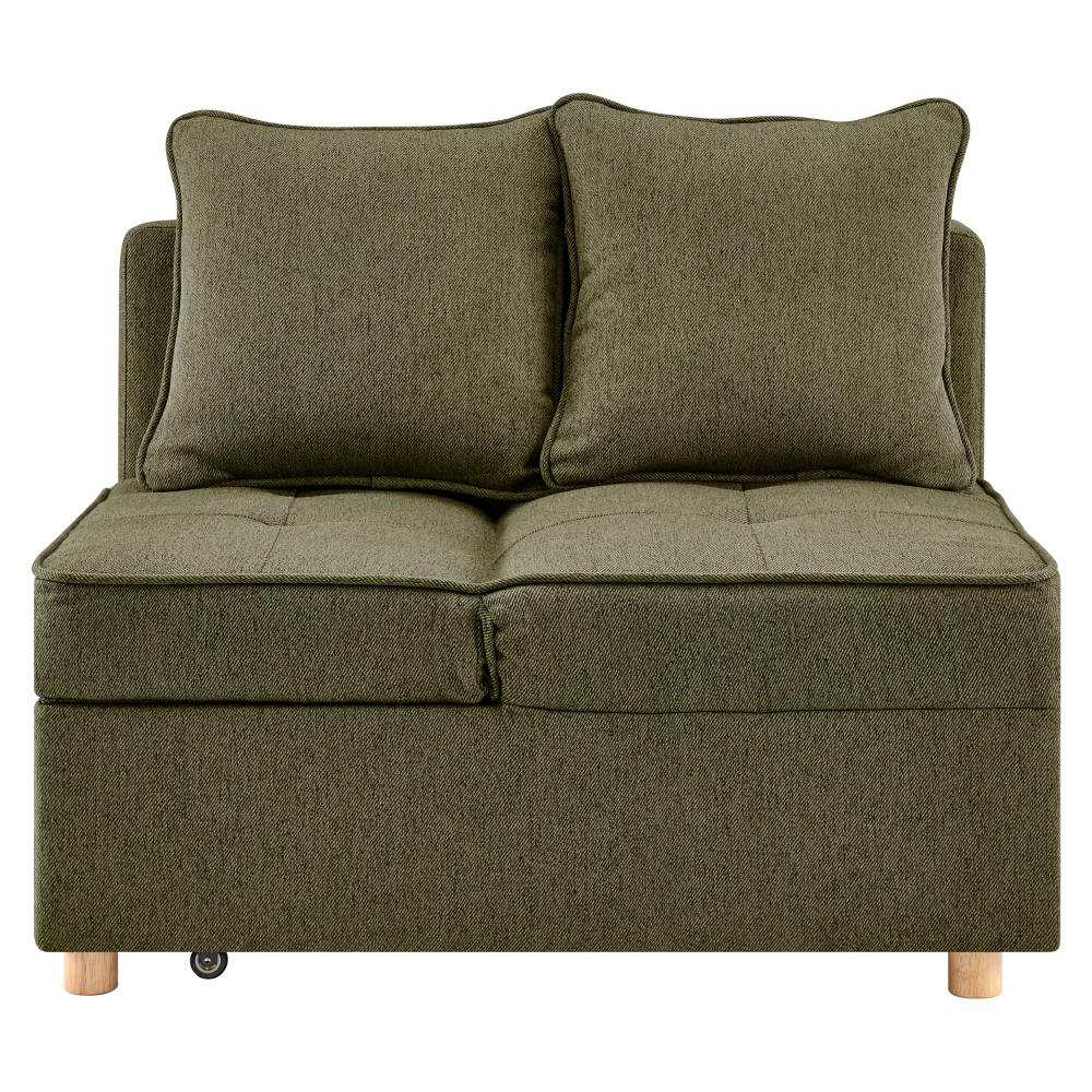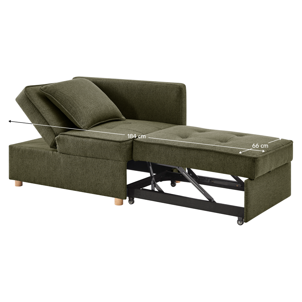 Materiál: látka Neve 39/dřevo/kov Oděruodolnost látky podle testu Martindale: 80 000 oděrů Barva: zelená Rozměry (ŠxHxV): 100,5x75x81,5 cm Plocha na spaní (ŠxD): 66x184 cm Výška sedu: 42 cm Výška sedu bez matrace: 28 cm Hloubka sedu: 35 cm Hloubka sedu bez polštářů: 50 cm Šířka sedu: 99 cm Šířka po rozložení: 184 cm Výška zádové opěrky: 38 cm Šířka zádové opěrky: 99 cm Výška matrace: 14 cm Nosnost: 90 kg na osobu Výplň: molitán Na nožičkách Materiál nožiček: bukové dřevo Barva nožiček: přírodní Výška spodního prostoru od podlahy: 5 cm 2-sed Pohovka Celočalouněná Rozkládací Polohovatelná opěrka hlavy 5 stupňů polohování Dodávána s polštáři Rozměry polštářů (ŠxHxV): 44x15x44 cm Dekorativní prošití Praktická Moderní design Dodáváno v demontu