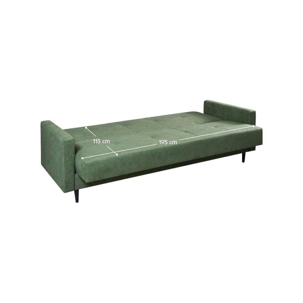 Materiál: látka Enjoy 47 Oděruodolnost textilie podle testu Martindale: 45 000 oděrů Barva: zelená Rozměry (ŠxHxV): 220x80x90 cm Výška sedu: 45 cm Hloubka sedu: 55 cm Výška opěrky zad: 54 cm Rozměry opěrky na ruku (ŠxHxV): 14x80x46 cm Plocha na spaní (ŠxD): 115x195 cm Kovové nožičky Barva nožiček: černá Výška spodního prostoru od podlahy: 13 cm Výplň: pružina falista/pur pěna Nosnost na osobu: 90 kg Celočalouněná Rozkládací S úložným prostorem Dodáváno v demontu Možnost objednání v 8 barevných provedeních látky Enjoy v ceně 13.190 Kč. Při individuální objednávce je třeba zaplatit 20% zálohu z dané částky. Po uhrazení zálohy bude Váš požadavek zadán do výroby. Dodací lhůta 6-8 týdnů.