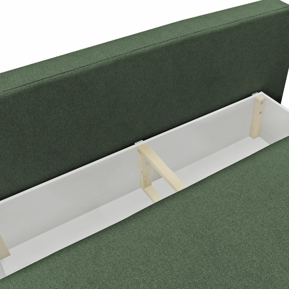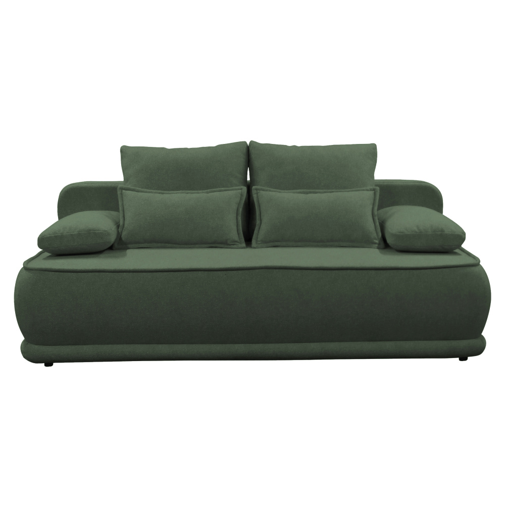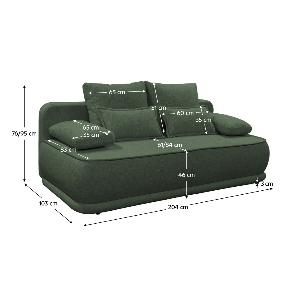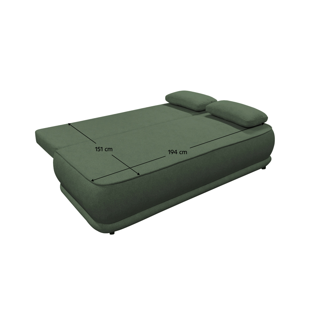 Materiál: látka Blur 12 Oděruodolnost textilie podle testu Martindale: 50 000 oděrů Barva: zelený melír Rozměry (ŠxHxV): 204x103x76/95 cm Plocha na spaní (ŠxD): 151x194 cm Výška sedu: 46 cm Hloubka sedu: 61/84 cm Nosnost na osobu: 90 kg Na nožičkách Materiál nožiček: plast Barva nožiček: černá Výška spodního prostoru od podlahy: 3 cm Výplň: pružina falista/pur pěna Celočalouněná Rozkládací Úložný prostor Dodávána s polštáři Rozměry velkých polštářů (ŠxV): 65x51 cm Rozměry menších polštářů (ŠxV): 60x35 cm Rozměry dekorativních polštářů (ŠxV): 65x35 cm Praktická Moderní Dodáváno v demontu