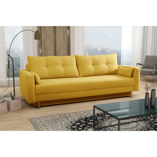 Materiál: látka Kronos 43 Oděruodolnost textilie podle testu Martindale: 60 000 oděrů Barva: žlutá Rozměry (ŠxHxV): 219x91x70/85 cm Plocha na spaní (ŠxH): 136x196 cm Hloubka sedu: 54 cm Výška sedu: 39 cm Šířka sedu: 195 cm Šířka opěrky na ruku: 12 cm Nosnost na osobu: 90 kg Dřevěné nožičky Barva nožiček: buk Výška nožiček: 13 cm Celočalouněná Rozkládací S úložným prostorem Dodávána s polštáři Rozměry opěrkového polštáře (ŠxV): 97x48 cm Rozměry dekorativního polštářku (ŠxV): 42x14 cm Výplň: pružina typu bonel Praktická Moderní Dodáváno v demontu Možnost objednání ve 4 barevných provedeních látky Paros a v 6 barevných provedeních látky Kronos ceně 16.990 Kč s dodací lhůtou 6-8 týdnů. Při individuální objednávce je třeba zaplatit 20% zálohu z dané částky. Po uhrazení zálohy bude Váš požadavek zadán do výroby.