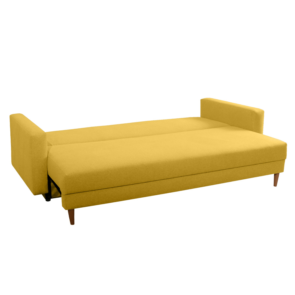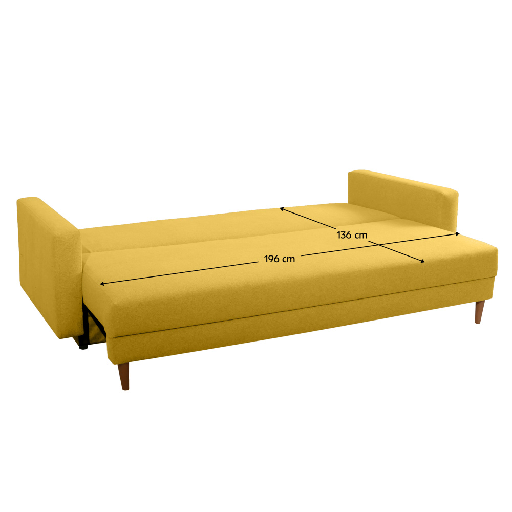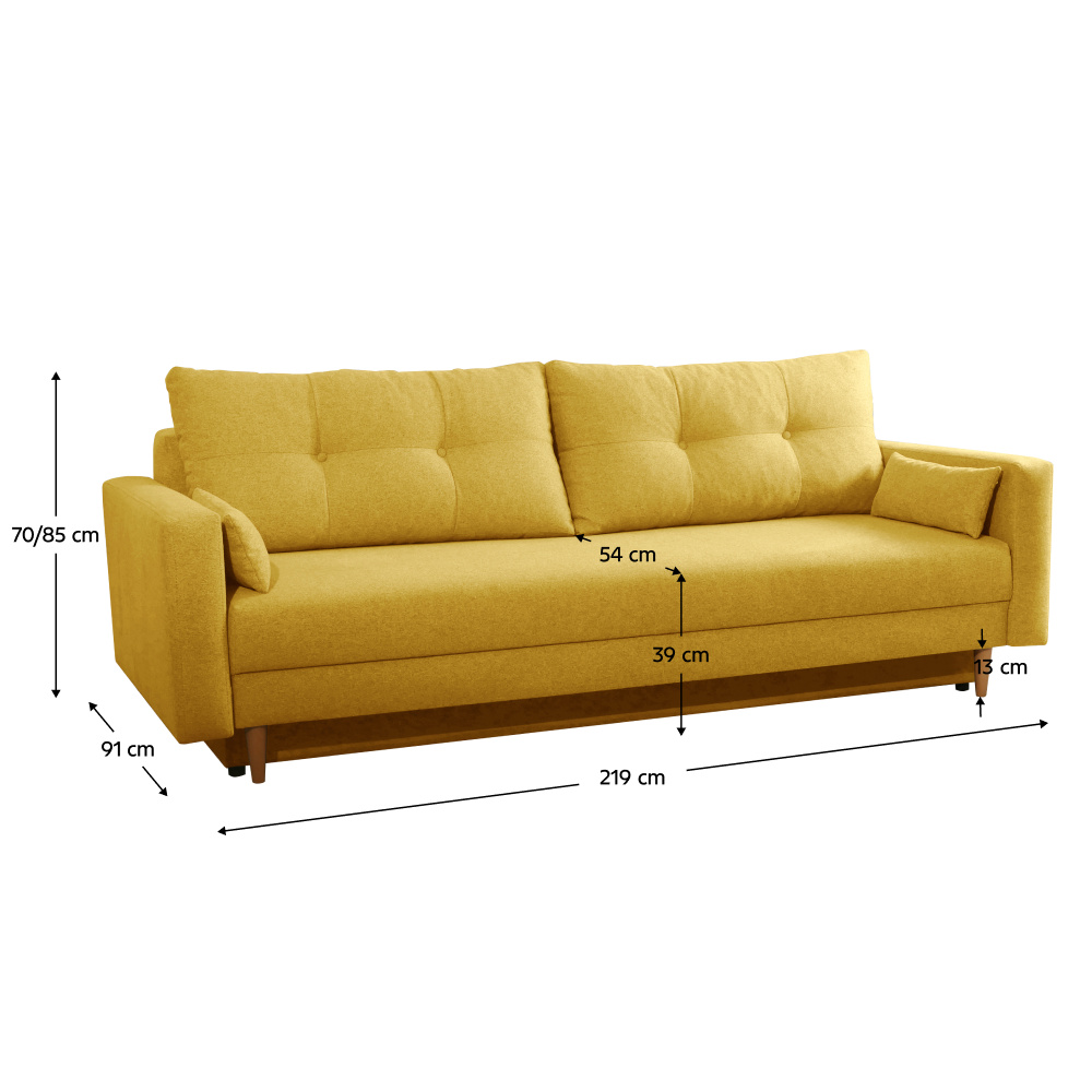 Materiál: látka Kronos 43 Oděruodolnost textilie podle testu Martindale: 50 000 oděrů Barva: žlutá Rozměry (ŠxHxV): 219x91x70/85 cm Plocha na spaní (ŠxH): 136x196 cm Hloubka sedu: 54 cm Výška sedu: 39 cm Šířka sedu: 195 cm Šířka opěrky na ruku: 12 cm Nosnost na osobu: 90 kg Dřevěné nožičky Barva nožiček: buk Výška nožiček: 13 cm Celočalouněná Rozkládací S úložným prostorem Dodávána s polštáři Rozměry opěrkového polštáře (ŠxV): 97x48 cm Rozměry dekorativního polštářku (ŠxV): 42x14 cm Výplň: pružina typu bonel Praktická Moderní Dodáváno v demontu