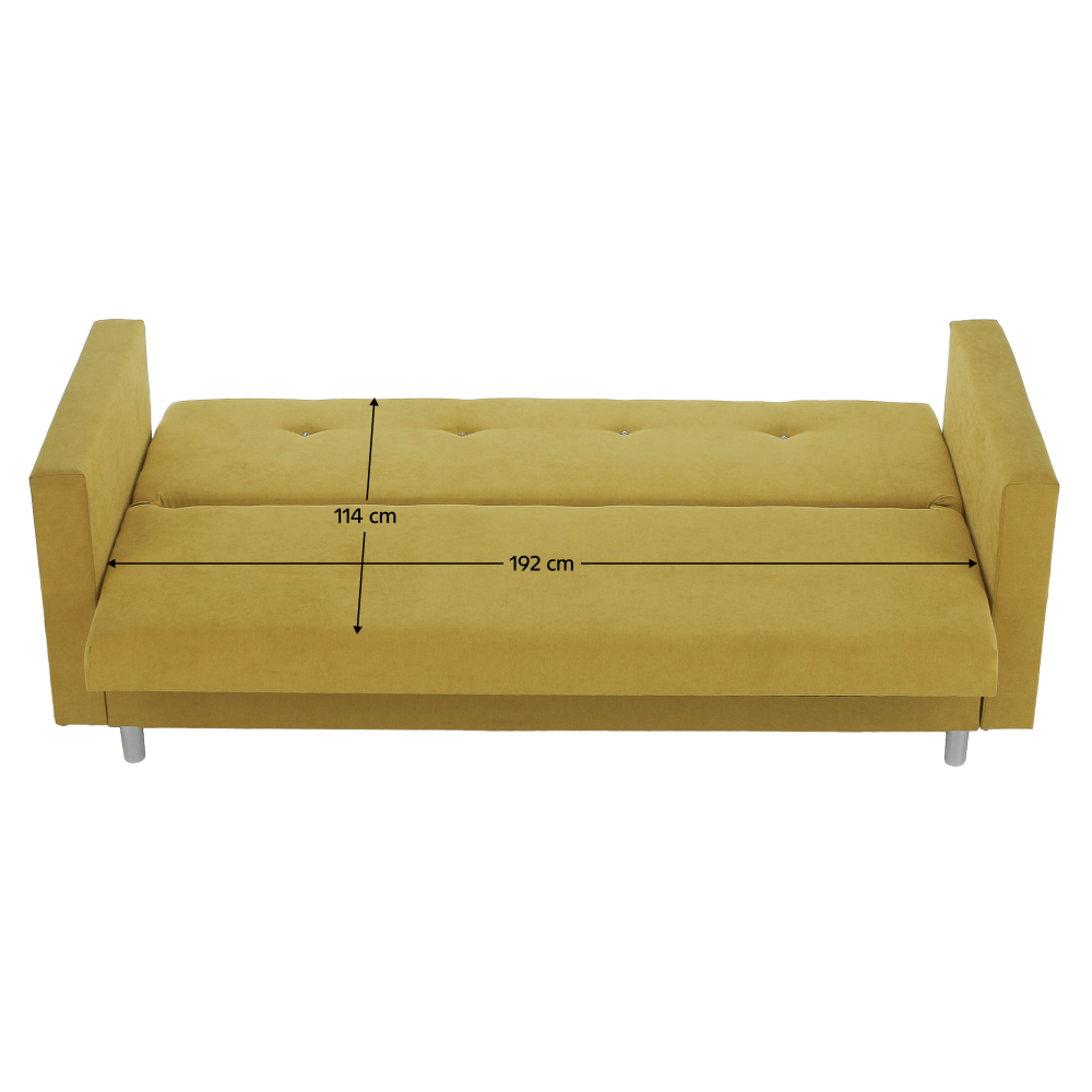 Materiál: látka Soro 40 Oděruodolnost látky podle testu Martindale: 90 000 oděrů Barva: žlutá Rozměry (ŠxHxV): 215x80x94 cm Plocha na spaní (ŠxD): 114x192 cm Výška sedu: 46 cm Hloubka sedu: 55 cm Na nožičkách Materiál nožiček: plast Barva nožiček: stříbrná Výška spodního prostoru od podlahy: 10 cm Nosnost na osobu: 90 kg Výplň: molitan Dekorativní prošívání s designovými prvky Rozkládací Úložný prostor Praktická Moderní Dodáváno v demontu