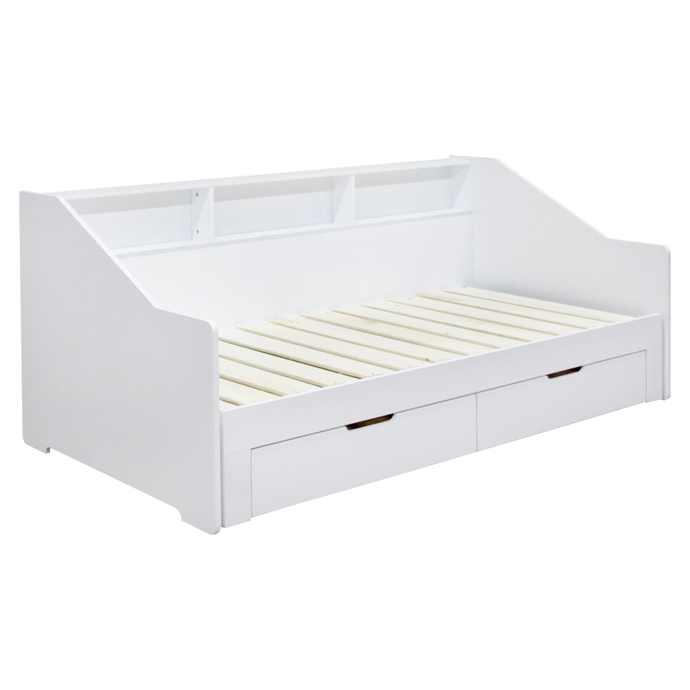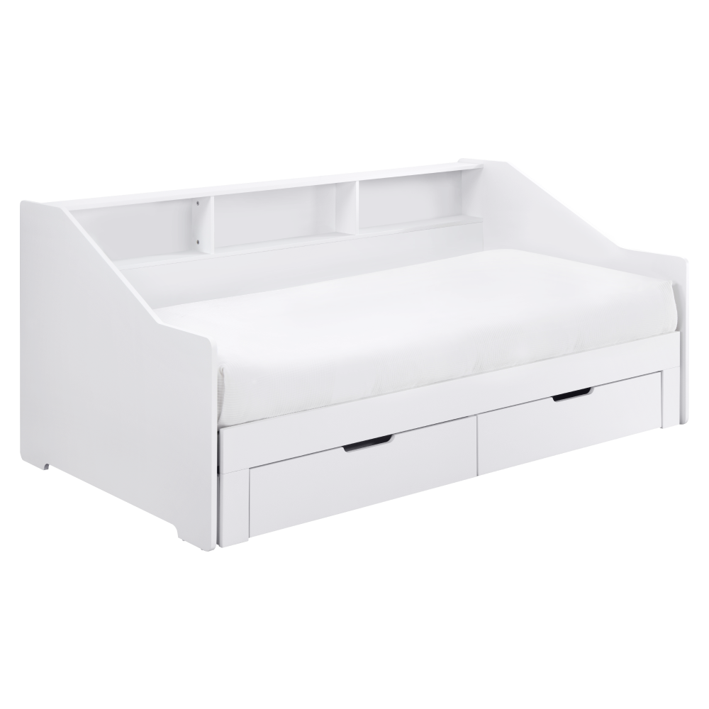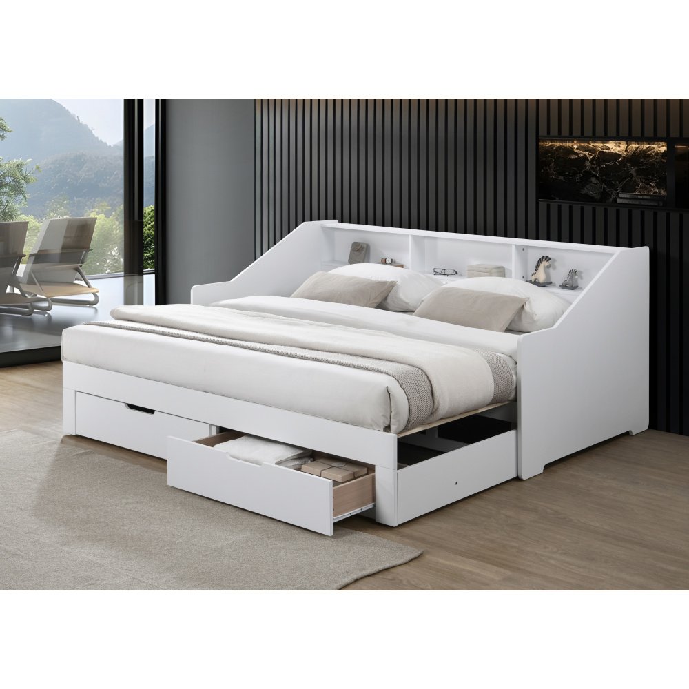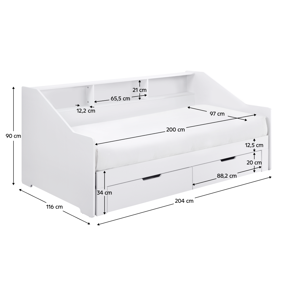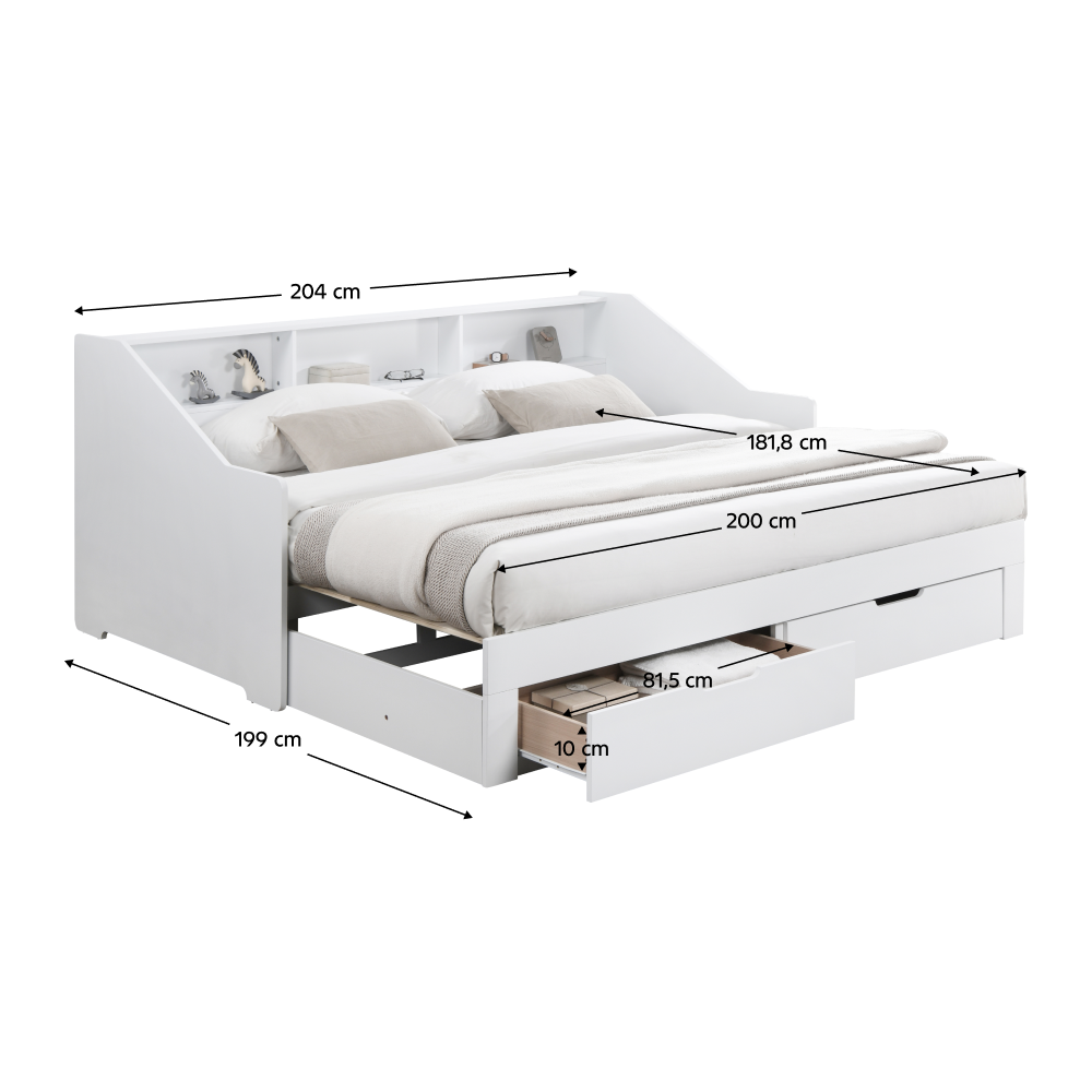 Materiál: MDF/masiv Barva: bílá Rozměry (ŠxHxV): 116x204x90 cm Rozměry po rozložení (ŠxHxV): 199x204x90 cm Plocha na spaní (ŠxD): 97x200 cm Plocha na spaní po rozkladu (ŠxD): 181,8x200 cm Výška po rošt: 33,4 cm Nosnost na lůžko: 135 kg Rozkládací Úložný prostor Dvě zásuvky Rozměry zásuvky (ŠxHxV): 88,2x31x20 cm Vnitřní rozměry zásuvky (ŠxHxV): 81,5x31,5x10 cm Nosnost zásuvky: 15 kg Dodáváno s masivním laťkovým roštem Prostor mezi laťkami: 1,2 cm Prostor mezi laťkami po rozložení: 8,7 cm Dodáváno bez matrace Doporučujeme zakoupit matraci z naší nabídky Doporučená výška matrace: 16 cm Zapuštění matrace: 1,2 cm Praktická Vyvýšená bočnice Tři police Dodáváno v demontu *Ke posteli je třeba zakoupit matrace. Pokud kupujete postel a plánujete ji používat rozloženou jako manželskou postel, doporučujeme matrace o rozměrech 90x200 nebo 180x200 cm z naší nabídky. Pokud postel budete používat většinou jako jednolůžko, v tom případě doporučujeme matrace o rozměru 85x200 a 95x200 cm z naší nabídky