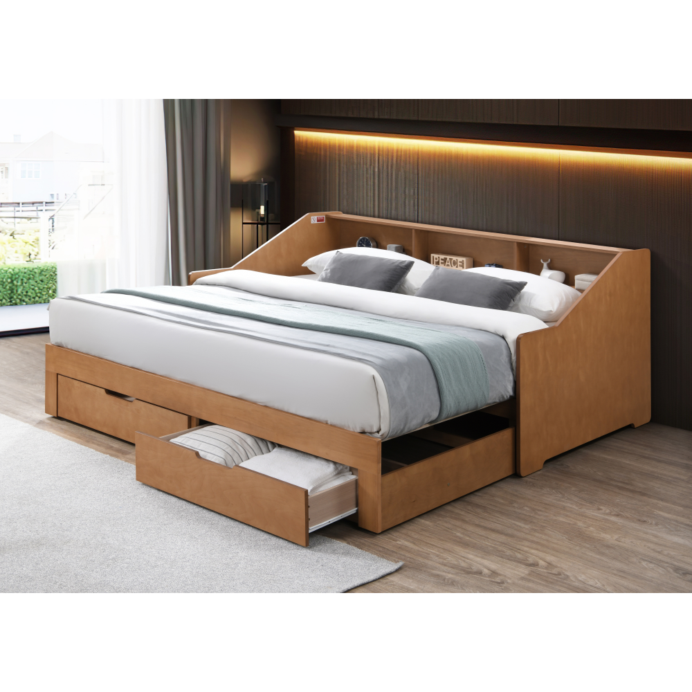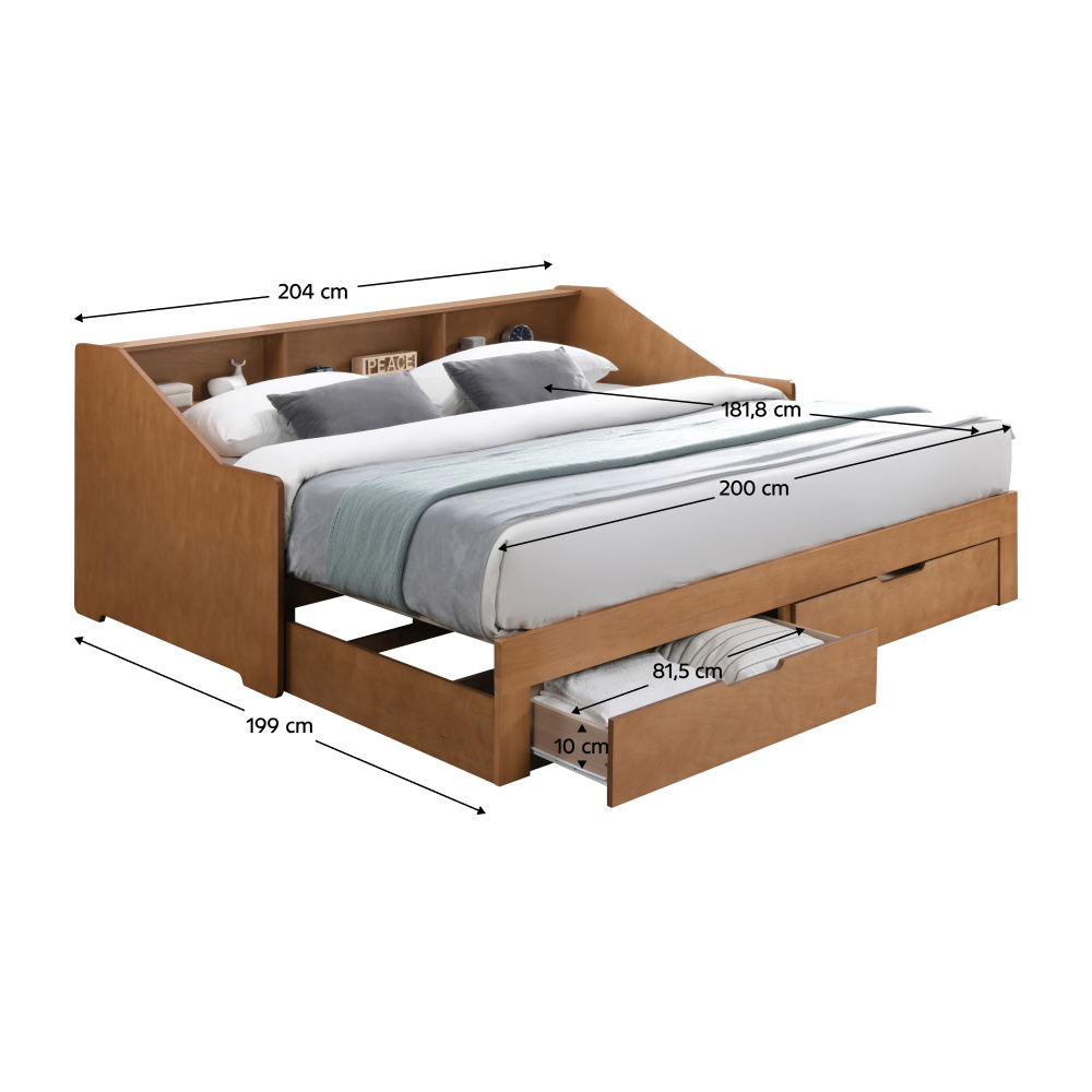 Materiál: MDF/dýha/masiv Barva: dub Rozměry (ŠxHxV): 116x204x90 cm Rozměry po rozložení (ŠxHxV): 199x204x90 cm Plocha na spaní (ŠxD): 97x200 cm Plocha na spaní po rozkladu (ŠxD): 181,8x200 cm Výška po rošt: 33,4 cm Nosnost na lůžko: 135 kg Rozkládací Úložný prostor Dvě zásuvky Rozměry zásuvky (ŠxHxV): 88,2x31x20 cm Vnitřní rozměry zásuvky (ŠxHxV): 81,5x31,5x10 cm Nosnost zásuvky: 15 kg Dodáváno s masivním laťkovým roštem Prostor mezi laťkami: 1,2 cm Prostor mezi laťkami po rozložení: 8,7 cm Dodáváno bez matrace Doporučujeme zakoupit matraci z naší nabídky Doporučená výška matrace: 16 cm Zapuštění matrace: 1,2 cm Praktická Vyvýšená bočnice Tři police Dodáváno v demontu *Ke posteli je třeba zakoupit matrace. Pokud kupujete postel a plánujete ji používat rozloženou jako manželskou postel, doporučujeme matrace o rozměrech 90x200 nebo 180x200 cm z naší nabídky. Pokud postel budete používat většinou jako jednolůžko, v tom případě doporučujeme matrace o rozměru 85x200 a 95x200 cm z naší nabídky
