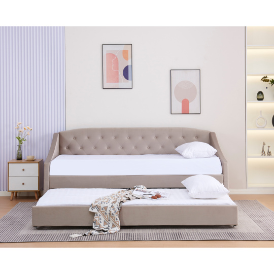 Materiál: Velvet látka/kov/pěna/překližka Oděruodolnost textilie podle testu Martindale: 80 000 oděrů Barva: hnědošedá Taupe Rozměry (ŠxHxV): 104x215x92 cm Plocha na spaní (ŠxD): 90x200 cm Výška po rošt: 42 cm Nosnost na osobu: 100 kg Na nožičkách Výška nožiček: 4 cm Výsuvná přistýlka Přistýlka na kolečkách Dodávána s lamelovým roštem Dodáváno bez matrace Doporučujeme zakoupit matraci z naší nabídky Rozměr matrace na přistýlku: 90x200 cm Doporučená výška matrace na přistýlku: 15 cm Doporučená výška matrace: 20 cm Dekorativně prošité čelo postele Elegantní Čalouněná Dodáváno v demontu