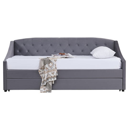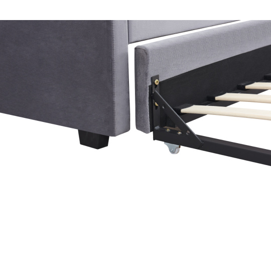 Materiál: Velvet látka/kov/pěna/překližka Oděruodolnost textilie podle testu Martindale: 80 000 oděrů Barva: šedá Rozměry (ŠxHxV): 104x215x92 cm Plocha na spaní (ŠxD): 90x200 cm Výška po rošt: 42 cm Nosnost na osobu: 100 kg Na nožičkách Výška nožiček: 4 cm Výsuvná přistýlka Přistýlka na kolečkách Dodávána s lamelovým roštem Dodáváno bez matrace Doporučujeme zakoupit matraci z naší nabídky Rozměr matrace na přistýlku: 90x200 cm Doporučená výška matrace na přistýlku: 15 cm Doporučená výška matrace: 20 cm Dekorativně prošité čelo postele Elegantní Čalouněná Dodáváno v demontu