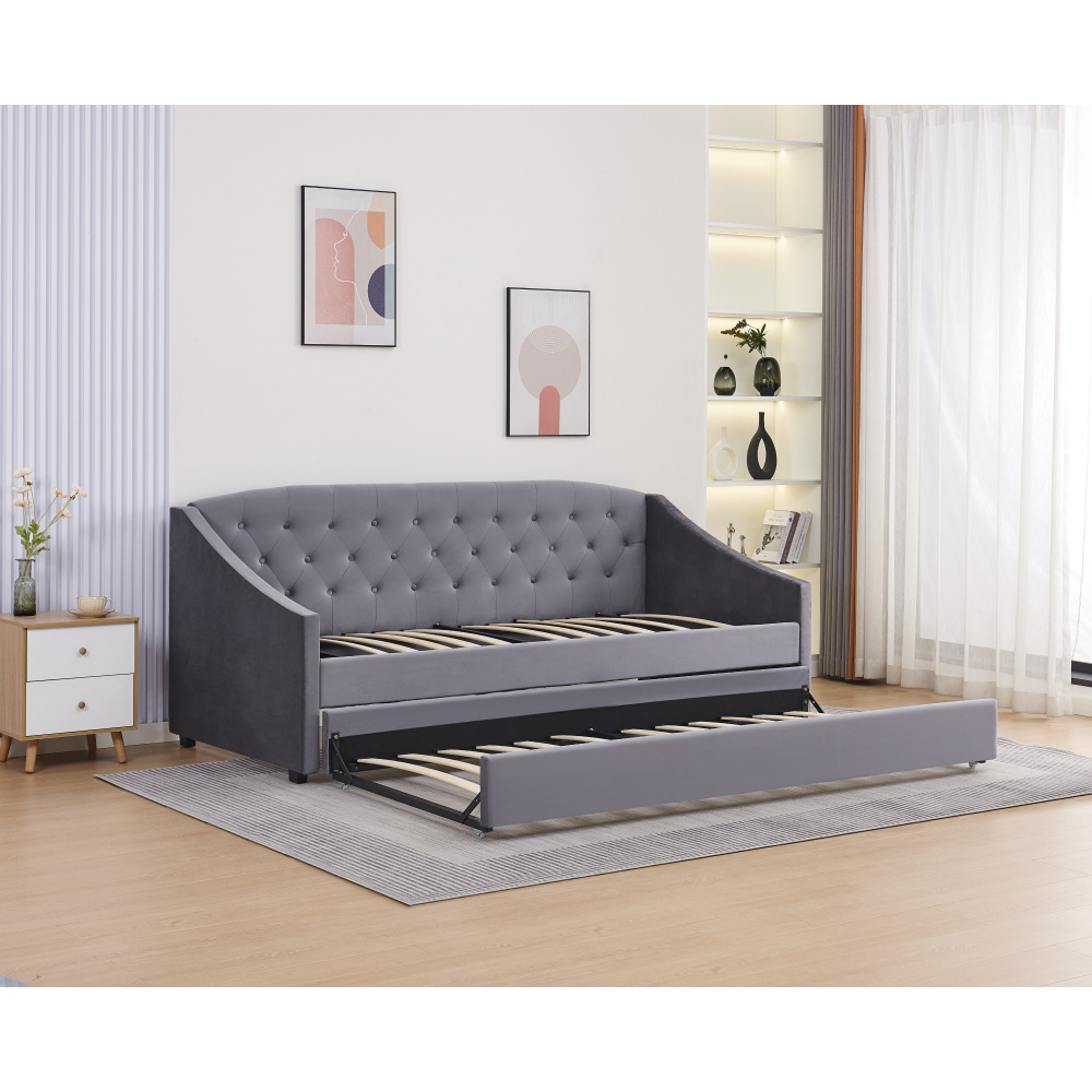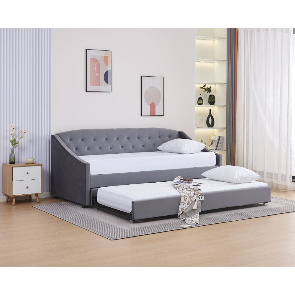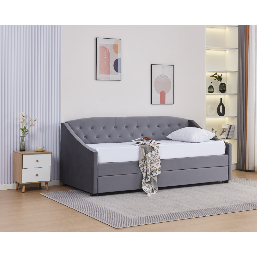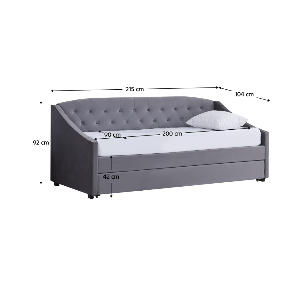 Materiál: Velvet látka/kov/pěna/překližka Oděruodolnost textilie podle testu Martindale: 80 000 oděrů Barva: šedá Rozměry (ŠxHxV): 104x215x92 cm Plocha na spaní (ŠxD): 90x200 cm Výška po rošt: 42 cm Nosnost na osobu: 100 kg Na nožičkách Výška nožiček: 4 cm Výsuvná přistýlka Přistýlka na kolečkách Dodávána s lamelovým roštem Dodáváno bez matrace Doporučujeme zakoupit matraci z naší nabídky Rozměr matrace na přistýlku: 90x200 cm Doporučená výška matrace na přistýlku: 15 cm Doporučená výška matrace: 20 cm Dekorativně prošité čelo postele Elegantní Čalouněná Dodáváno v demontu