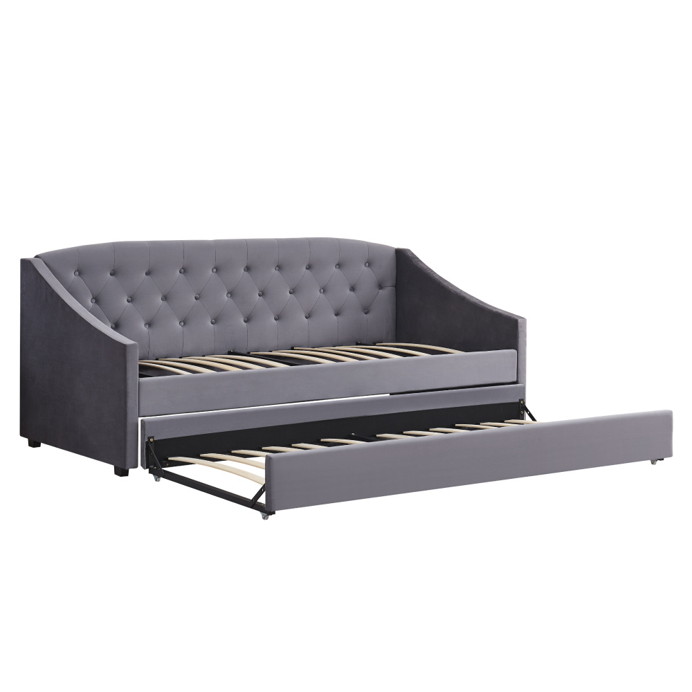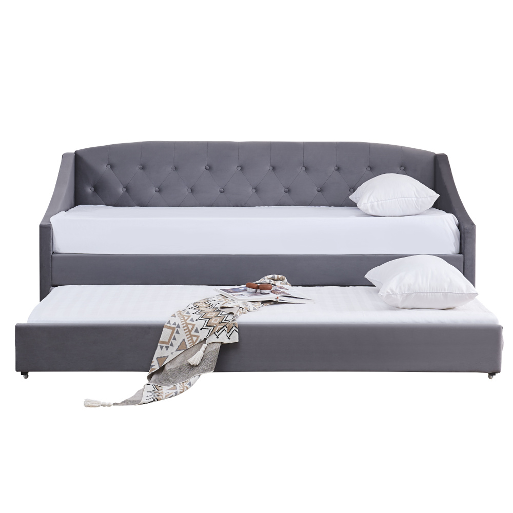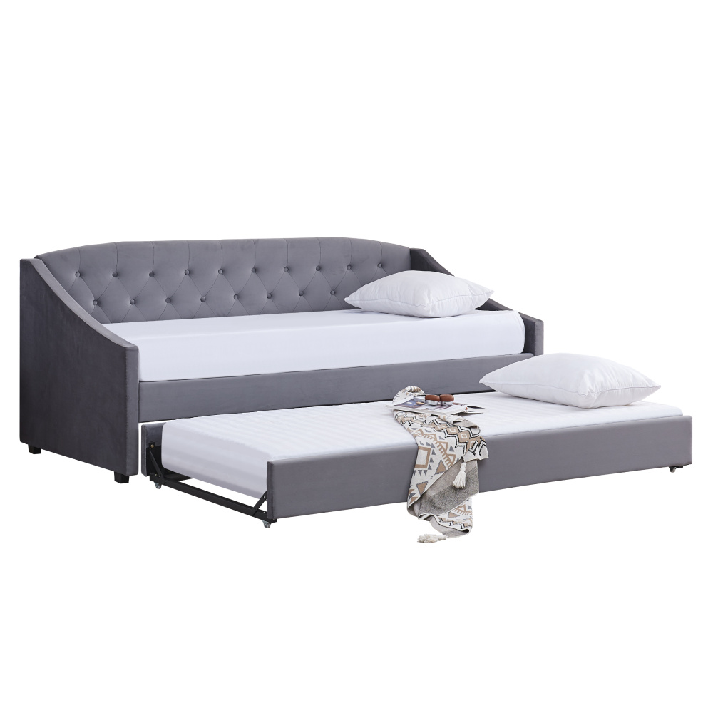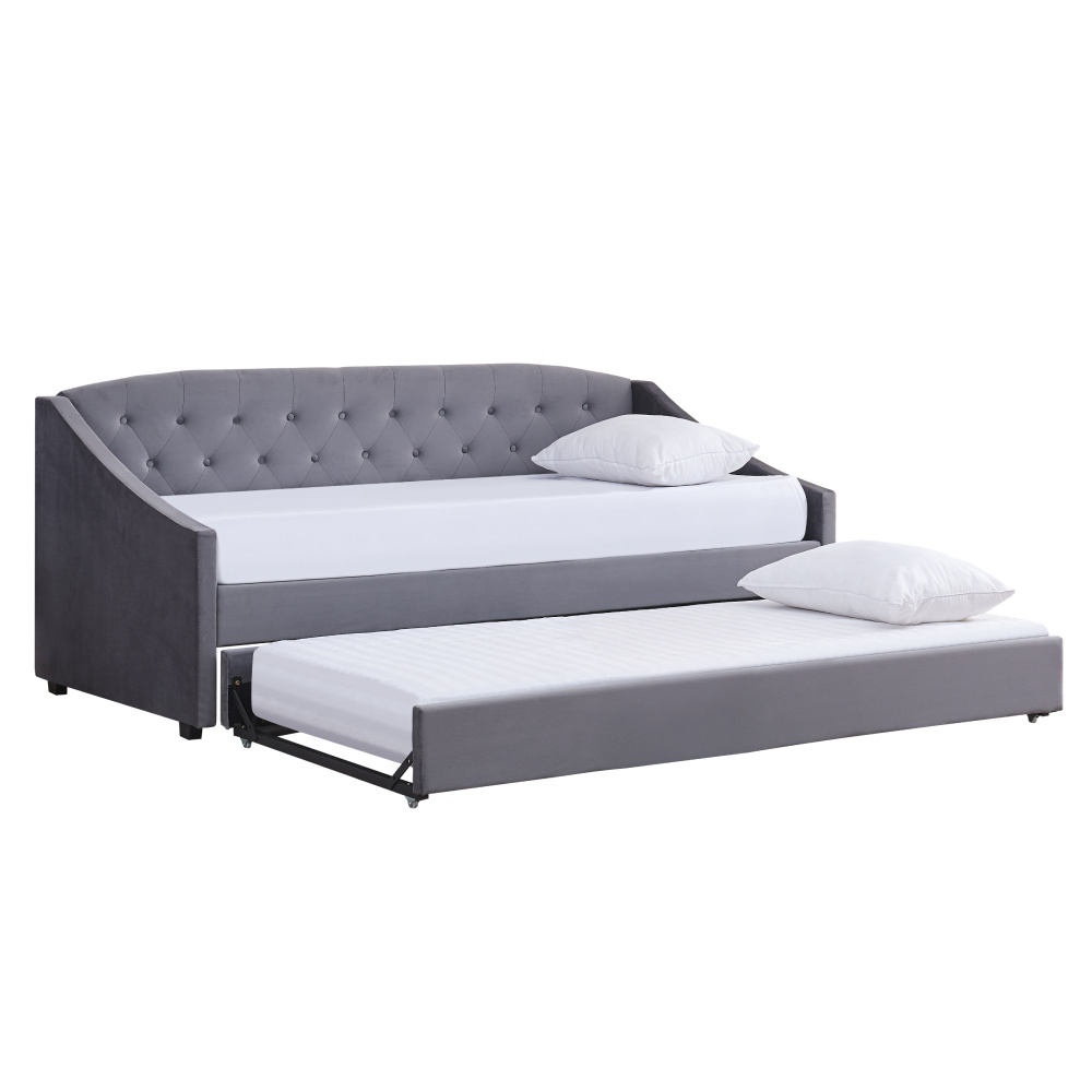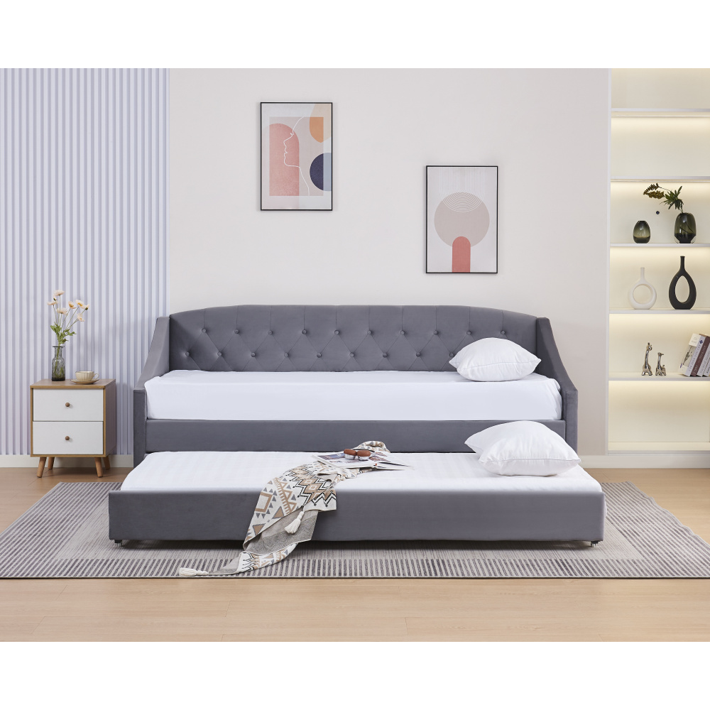 Materiál: Velvet látka/kov/pěna/překližka Oděruodolnost textilie podle testu Martindale: 80 000 oděrů Barva: šedá Rozměry (ŠxHxV): 104x215x92 cm Plocha na spaní (ŠxD): 90x200 cm Výška po rošt: 42 cm Nosnost na osobu: 100 kg Na nožičkách Výška nožiček: 4 cm Výsuvná přistýlka Přistýlka na kolečkách Dodávána s lamelovým roštem Dodáváno bez matrace Doporučujeme zakoupit matraci z naší nabídky Rozměr matrace na přistýlku: 90x200 cm Doporučená výška matrace na přistýlku: 15 cm Doporučená výška matrace: 20 cm Dekorativně prošité čelo postele Elegantní Čalouněná Dodáváno v demontu