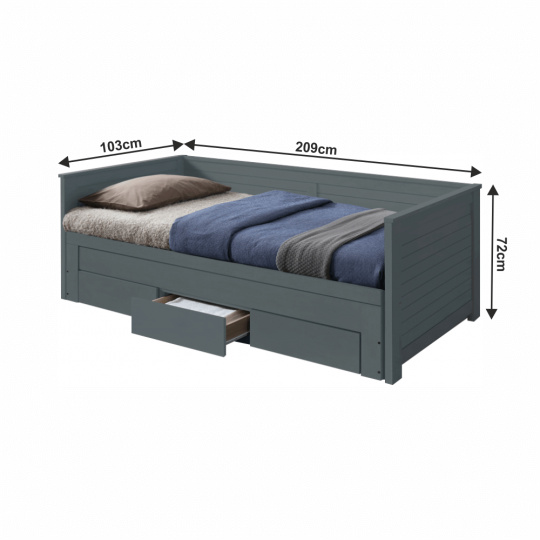 Materiál: masivní dřevo / MDF Barva: šedá Rozměry (ŠxHxV): 209x103x72 cm Rozměry jednolůžka (ŠxHxV): 97x200 cm Rozměry postele po rozložení (ŠxHxV): 180x200 cm Hloubka postele po rozložení: 186 cm Vysouvací konstrukce na kolečkách Dodávané s 2 laťkový rošt Výška po rošt: 36 cm Nosnost: 110 kg Nosnost po rozložení: 180 kg S boční zástěnou S 3 šuplíky Dodávané bez matrace Možnost zakoupit matrace z naší nabídky Dodávané v demontu *Ke posteli je třeba zakoupit matrace. Pokud kupujete postel a plánujete ji používat rozloženou jako manželskou postel, doporučujeme matrace o rozměrech 90x200 nebo 180x200 cm z naší nabídky. Pokud postel budete používat většinou jako jednolůžko, v tom případě doporučujeme matrace o rozměru 85x200 a 95x200 cm z naší nabídky.