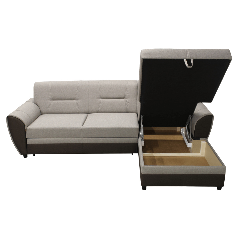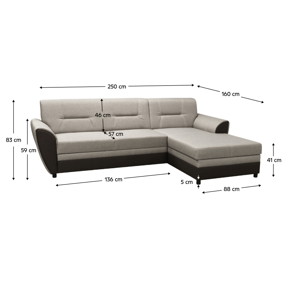 Materiál: látka Malmo 28/16 Taupe Oděruodolnost textilie podle testu Martindale: 30 000 oděrů Barva: hnědá/béžovošedá Rozměry (ŠxHxV): 250x16x83 cm Výška sedu: 41 cm Hloubka sedu: 57 cm Výška spodního prostoru od podlahy: 5 cm Rozkládací Plocha na spaní (ŠxD): 128x203 cm Výška opěrky na záda: 46 cm Šířka otomanu: 86 cm Šířka sedáku: 136 cm Rohová S úložným prostorem Dekorativní prošití zádové části Výplň: pružina falista/pur pěna Na plastových nožičkách Barva nožiček: černá Celočalouněná Pravé provedení Dodáváno bez polštářů Dodáváno v demontu