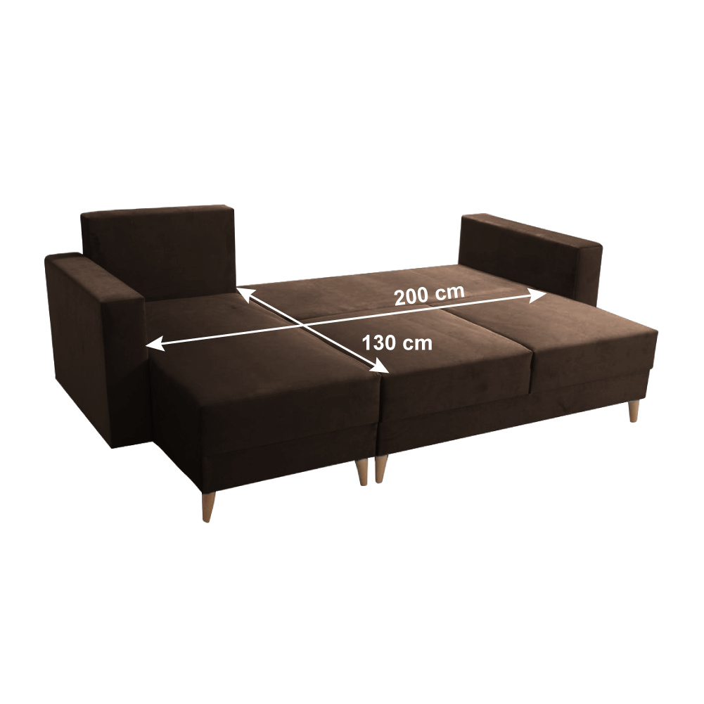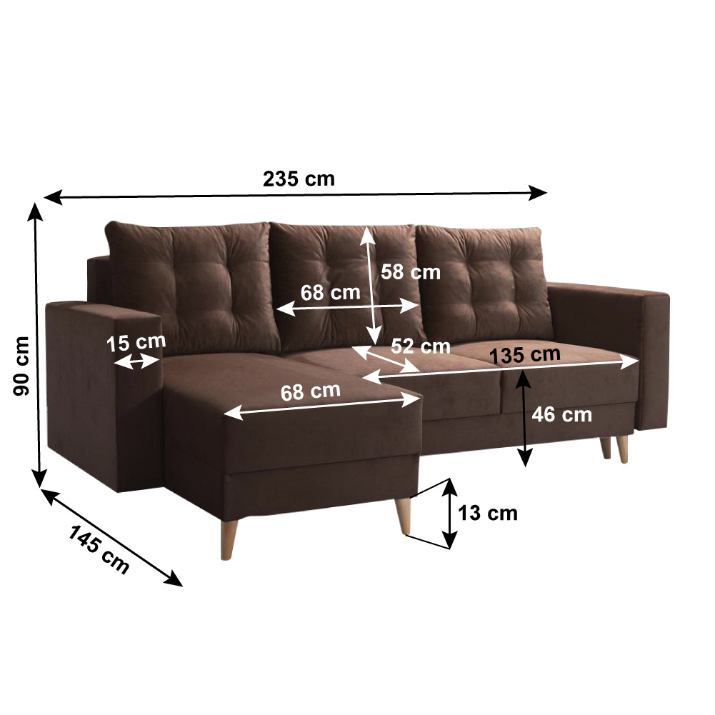 Materiál čalounění: látka Kronos 6 Oděruodolnost látky podle testu Martindale: 50 000 Barva čalounění: hnědá Rozměry (ŠxHxV): 235x145x90 cm Plocha na spaní (ŠxD): 130x200 cm Výška sedu: 46 cm Hloubka sedu: 52 cm Šířka otomanu: 68 cm Šířka sedáku: 135 cm Šířka opěrky na ruku: 15 cm Výška spodního prostoru od podlahy: 13 cm Na dřevěných nožičkách Barva nožiček: buk Nosnost na osobu: 90 kg Výplň: pružina falista + Pur pěna Dodávána se třemi polštáři Rozměry polštářů (ŠxV): 68x58 cm Rozkládací Rohová Celočalouněná S úložným prostorem Levé provedení Dodáváno v demontu