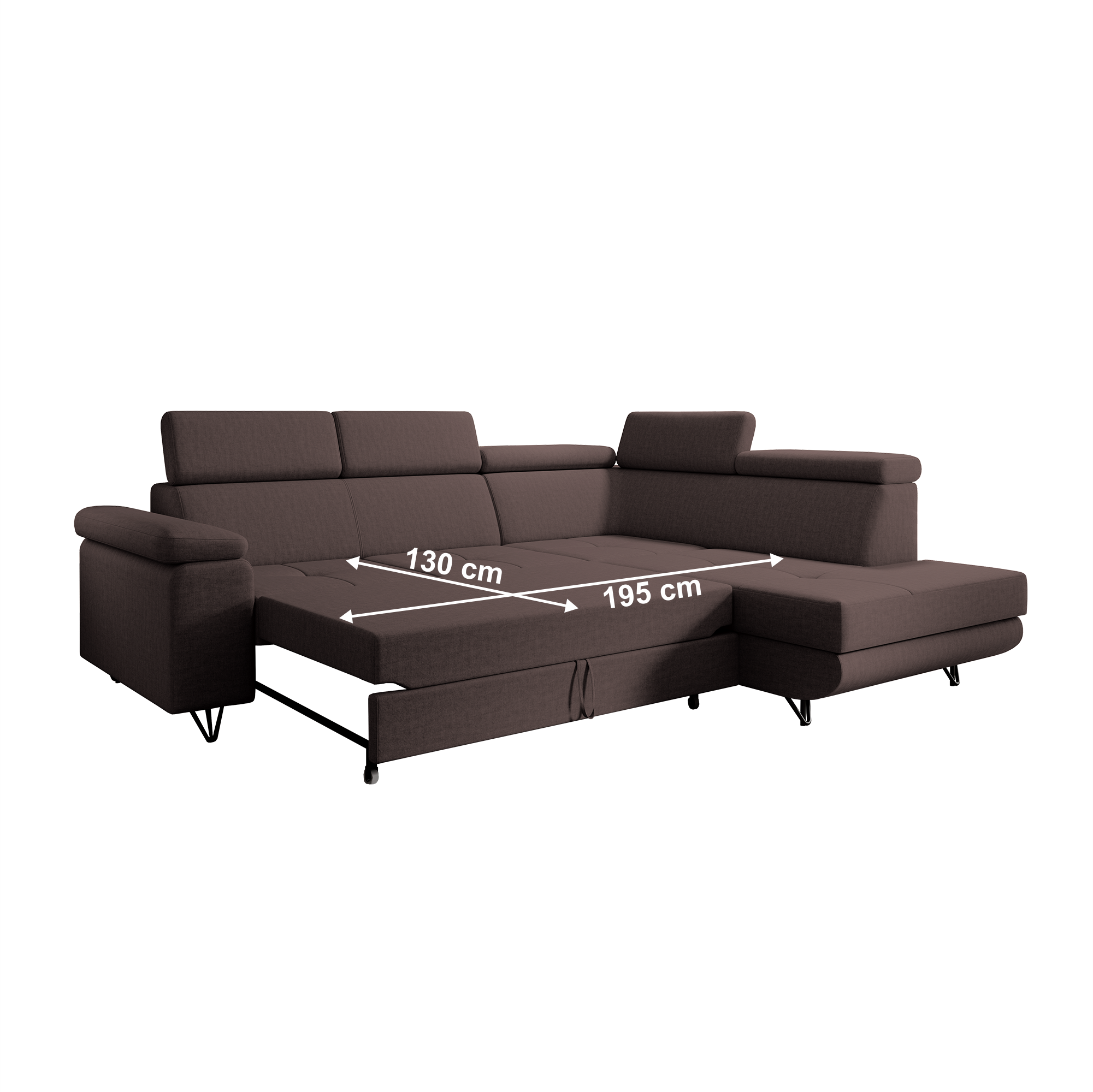 Materiál: látka Soro 28 Oděruodolnost textilie podle testu Martindale: 90 000- 100 000 oděrů Barva: hnědá Rozměry (ŠxHxV): 250x183x76/90 cm Výška sedu: 42 cm Hloubka sedu: 60 cm Výška spodního prostoru od podlahy: 12 cm Rozkládací Plocha na spaní (ŠxD): 130x195 cm Výška zádové opěrky: 50 cm Šířka otomanu: 91 cm Opěrka na ruku (HxV): 23x61 cm Nosnost: 90 kg Rohová S úložným prostorem 5 polohovacích opěrek hlavy Na kovových nožičkách Barva nožiček: černá Výplň: pružina falista/pur pěna T30 Celočalouněná Pravé provedení Dodáváno v demontu Nabízíme vám možnost objednat si sedačku v 7 barevných provedeních látky Soro v ceně: 29.390 Kč. Při individuální objednávce je třeba zaplatit 20% zálohu z dané částky. Po uhrazení zálohy bude Váš požadavek zadán do výroby. Doba dodání 6-8 týdnů.