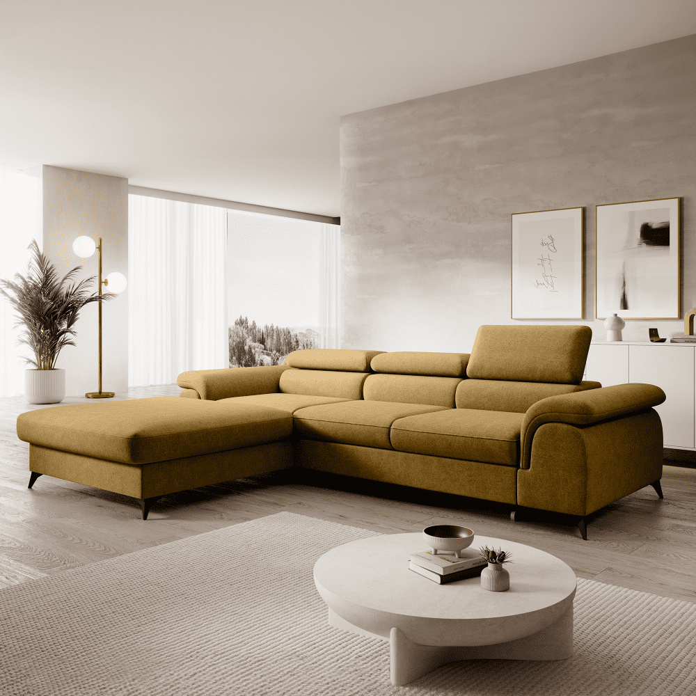 Materiál čalounění: WHISPER 10 Oděruodolnost látky podle testu Martindale: 100 000 Barva čalounění: hořčicová Rozměry (ŠxHxV): 275x205x75/95 cm Plocha na spaní (ŠxD): 125x195 cm Výška sedu: 43 cm Hloubka sedu: 58 cm Rozměry otomanu (ŠxH): 105x165 cm Rozměry opěrky na ruce (ŠxHxV): 35x100x57 cm Šířka sedáku: 140 cm Na nožičkách Materiál nožiček: kov Barva nožiček: černá Výška spodního prostoru od podlahy: 10,5 cm Výplň: pružina falista + Pur pěna Rozkládací Rohová Celočalouněná S úložným prostorem Tři polohovací opěrky hlavy 5 stupňové polohování opěrek Ve tvaru L Levé provedení Dodáváno v demontu Možnost objednání v 8 barevných odstínech látky Whisper v ceně 36.390 Kč s dodací lhůtou 6-8 týdnů. Při individuální objednávce je třeba zaplatit 20% zálohu z dané částky. Po uhrazení zálohy bude Váš požadavek zadán do výroby.